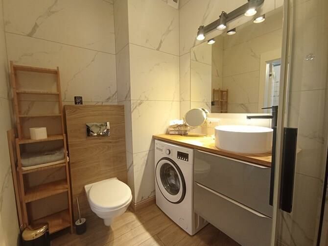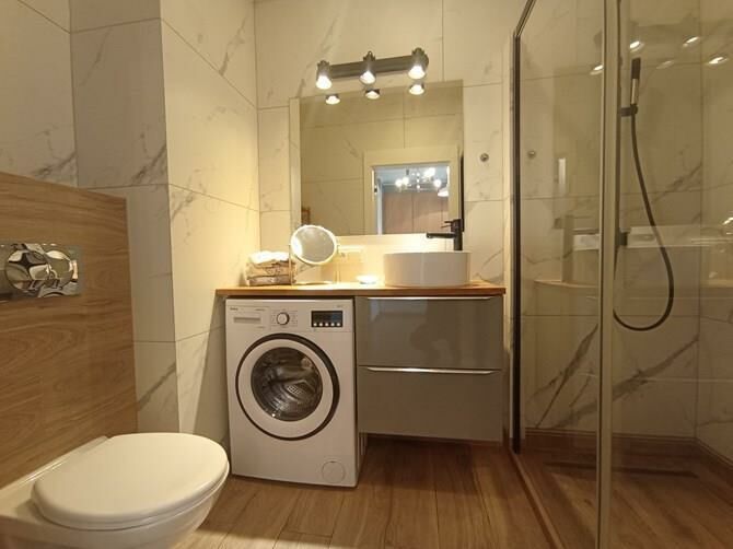 Łazienka z WC: szafka, lustro, kabina prysznicowa, pralka