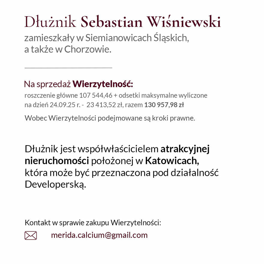 Dłużnik Sebastian Wiśniewski, zamieszkały w Chorzowie i Siemianowicach Śląskich.