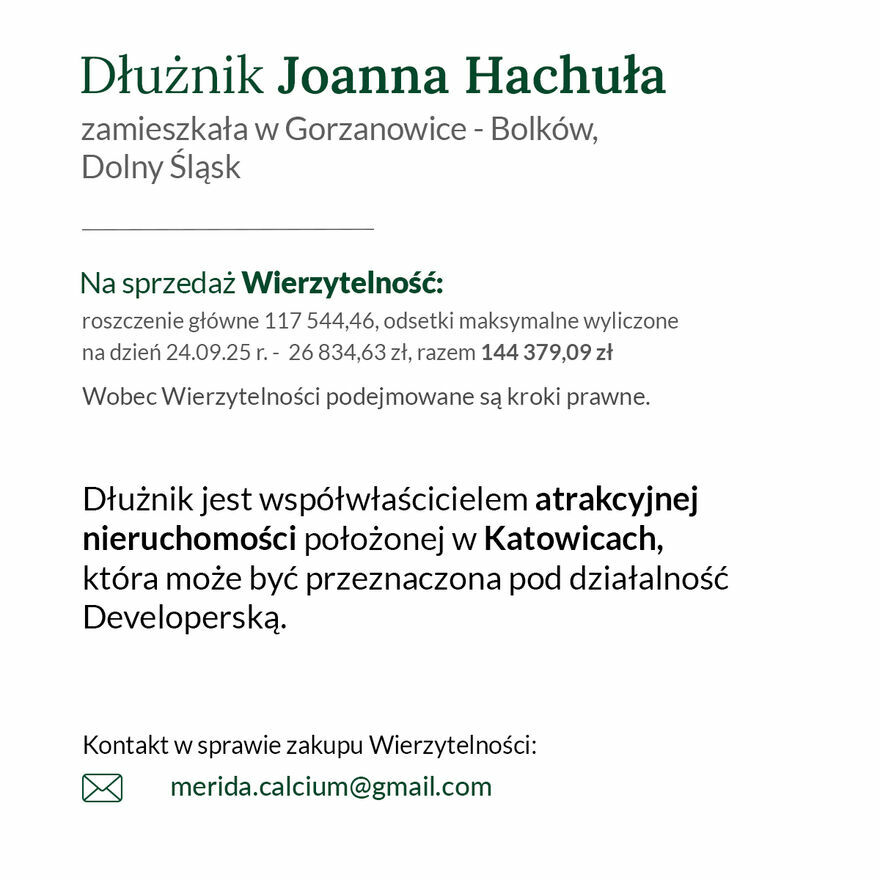 Szanowni Państwo, na sprzedaż Trzy wierzytelności - CESJA WIERZYTELNOŚCI - Dłużnicy są w posiadaniu , jako współwłaściciele dużej nieruchomości w Katowicach (działka budowlana) - Dąbrówka Mała.Działka jest idealna pod tzw. Developerkę.