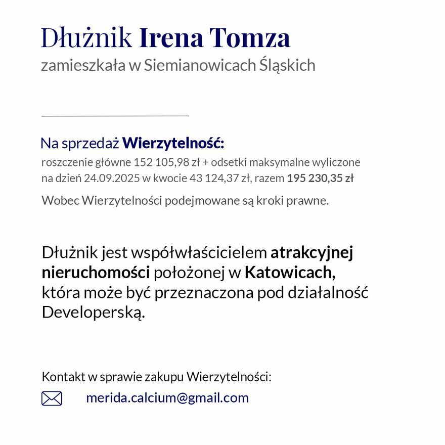 Dłużnik Irena Tomza, zamieszkała w Siemianowicach Śląskich.