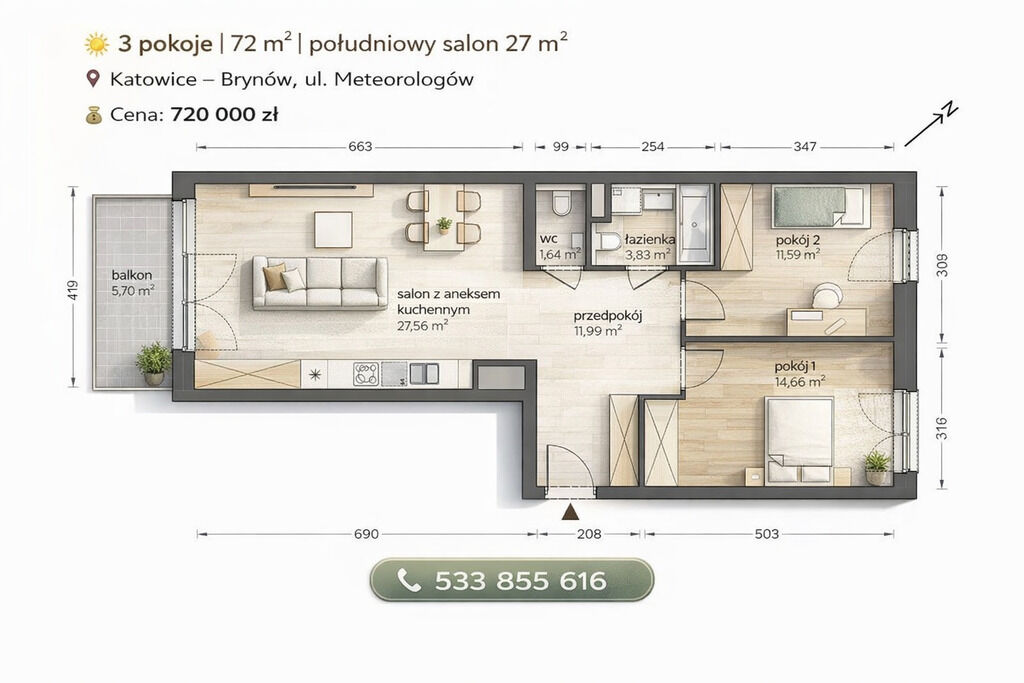 Brynów 3 pokoje odbiór marzec salon 28m