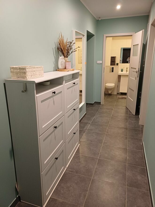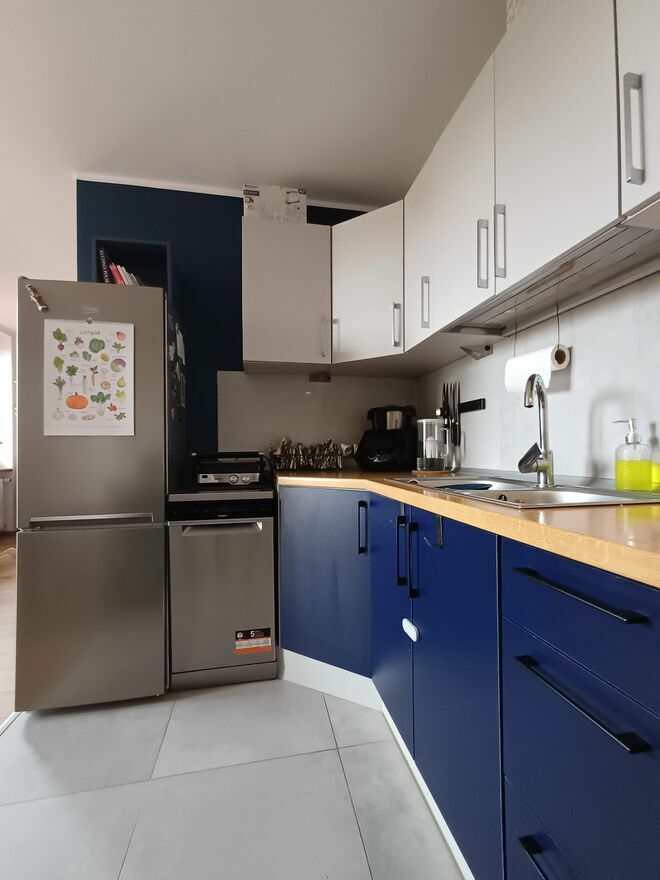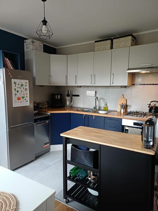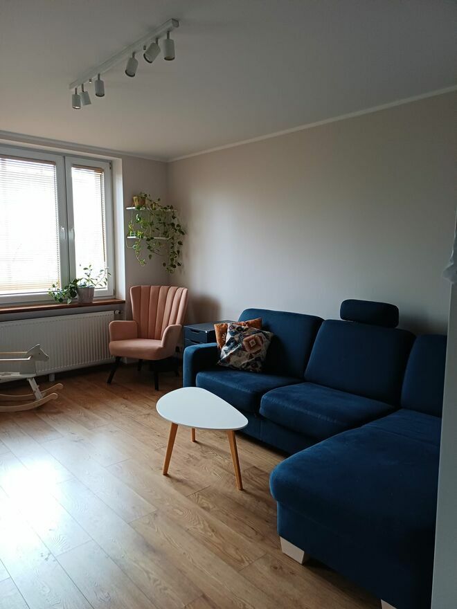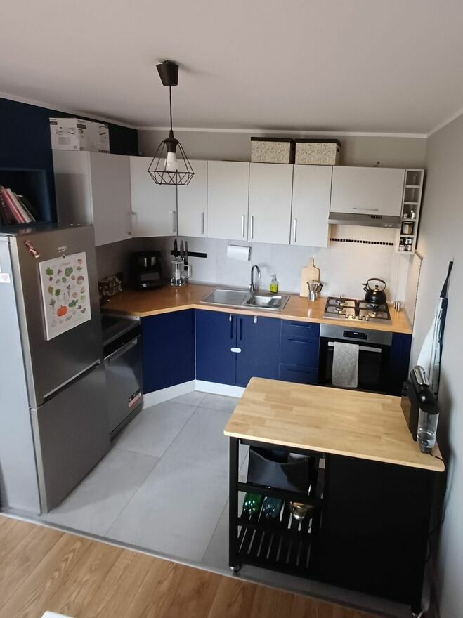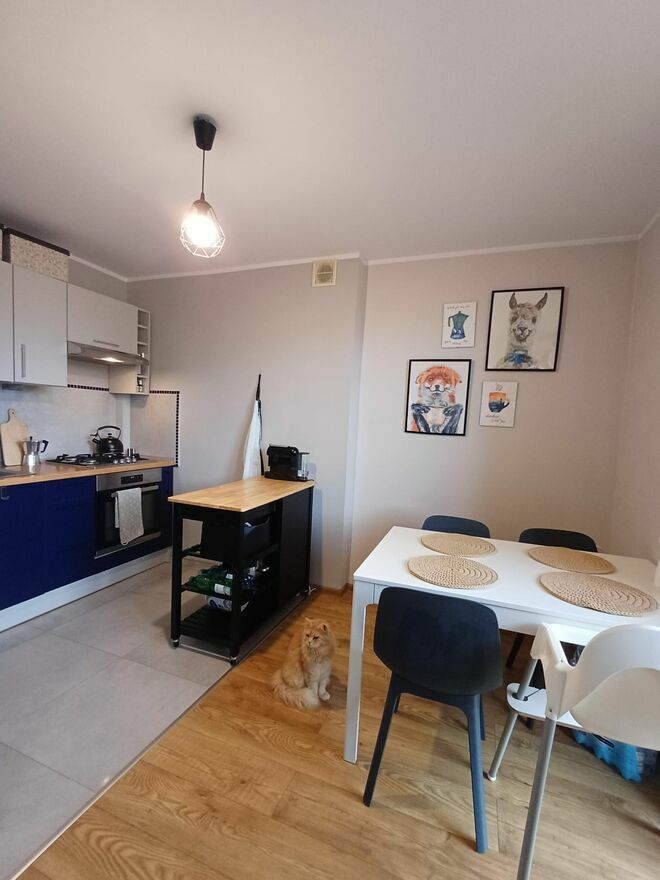 W mieszkaniu zostaje kilka ważnych elementów wyposażenia, dzięki czemu, lokal nadaje się też pod inwestycję. W sypialni: łóżko z pojemnikiem (140 cm), robiona na wymiar szafa trzydrzwiowa. W przedpokoju: garderoba robiona na wymiar. W salonie: granatowa kanapa, biały regał na książki, biała komoda pod RTV. W kuchni: stała zabudowa robiona na wymiar, płyta gazowa, piekarnik, zmywarka, lodówka, biały stół i granatowe krzesła. Reszta elementów do dogadania.