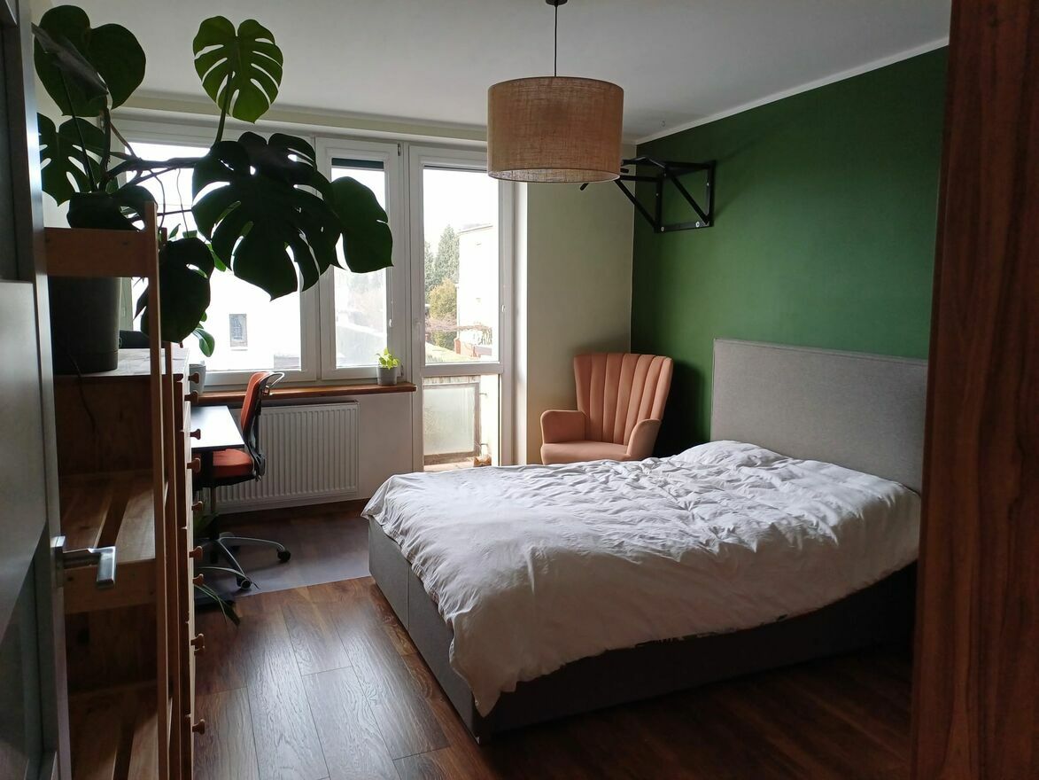 Oba pokoje (sypialnia [ok. 15 m2] i salon połączony z kuchnią [ok. 29 m2]) są bardzo ustawne i jasne. Z salonu okna wychodzą na wschód, z kolei z sypialni na zachód.