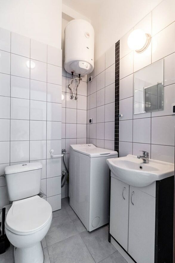 Łazienka: szafka, umywalka, pralka, kabina prysznicowa