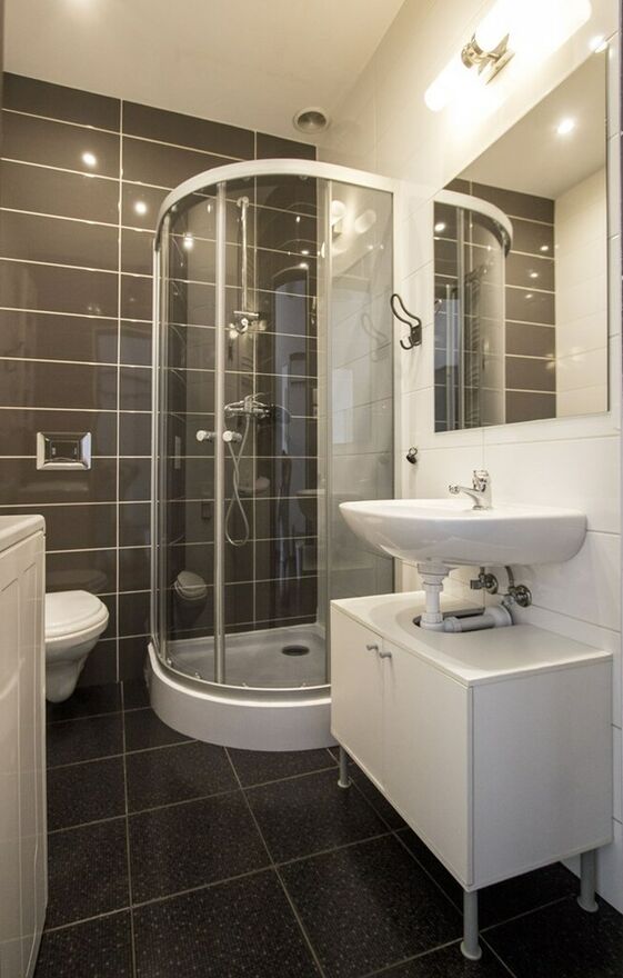Łazienka z WC: kabina prysznicowa, umywalka, pralka, szafka, lustro.