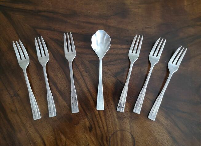 Oferuję zestaw platerowanych widelczyków do ciast dla 6 osób firmy HEFRA, sygnowany FH MET 60 wraz z łyżeczką do cukru ...