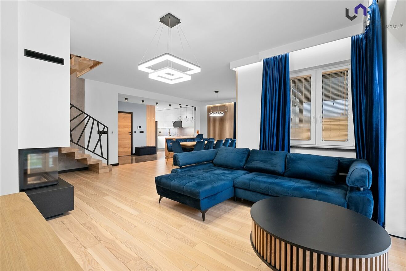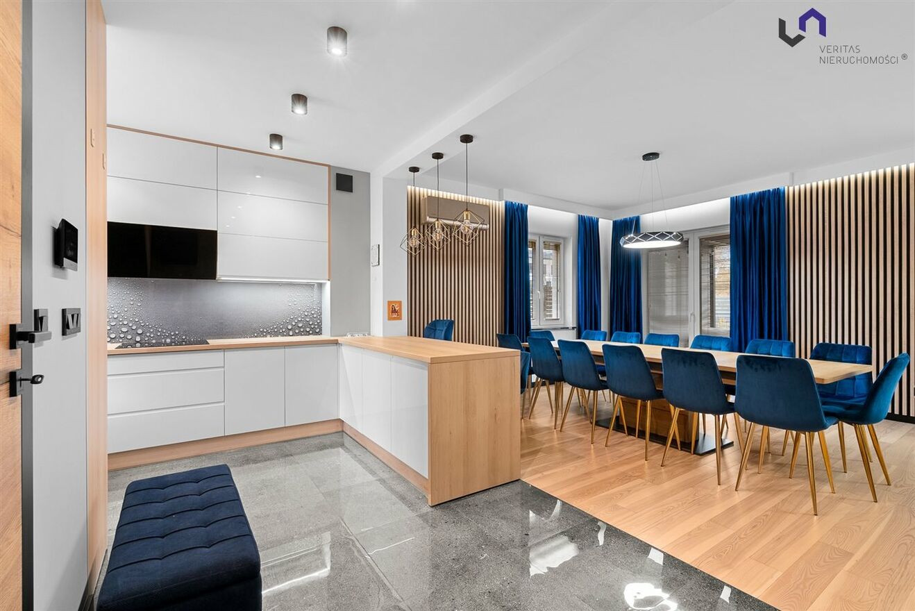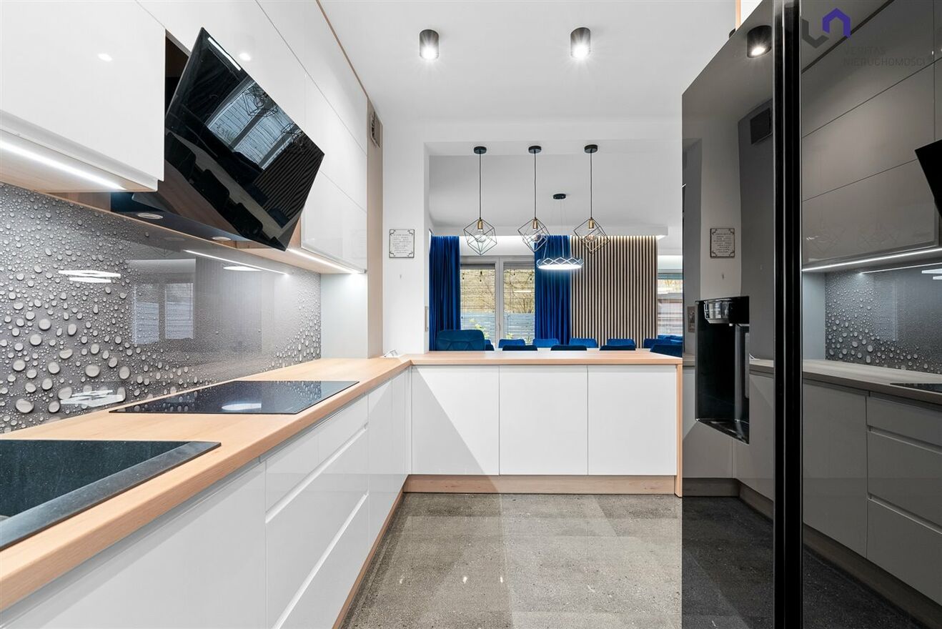 - Kuchnia z oknem z w pełni umeblowana (meble w zabudowie na wymiar) i wyposażona w sprzęt AGD(płyta indukcyjna, zmywarka, lodówka, piekarnik, okap) + wyspa.