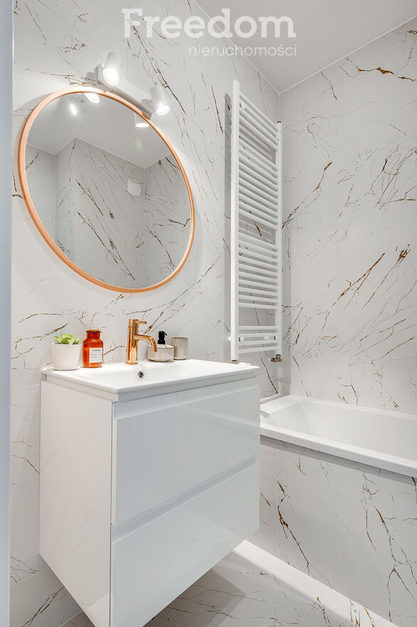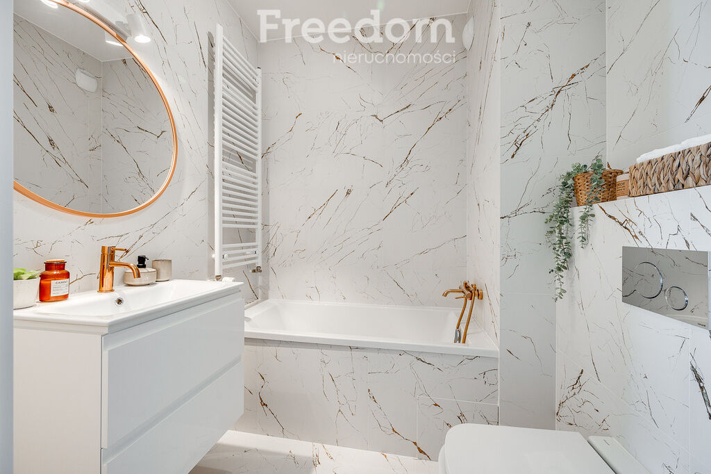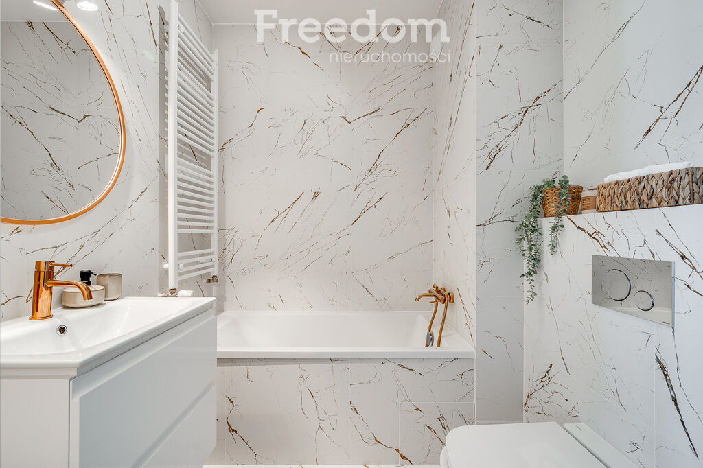 Jasna, nowa łazienka wyposażona jest w wannę, WC, umywalkę oraz