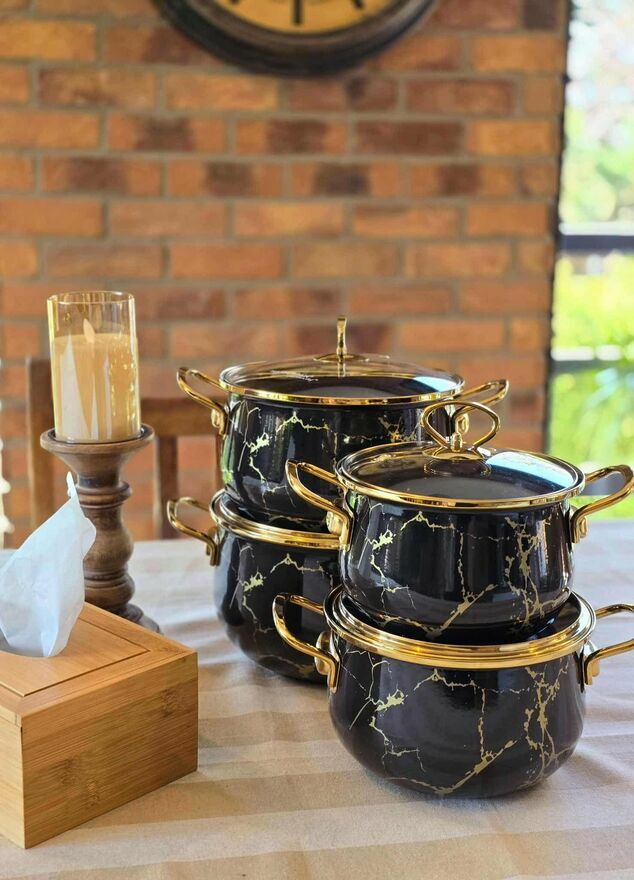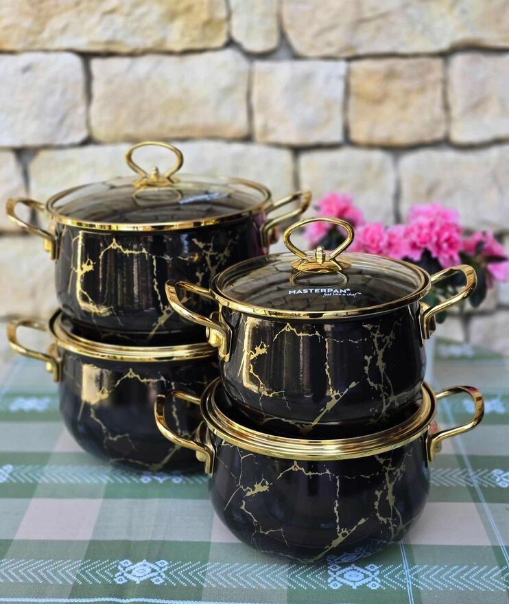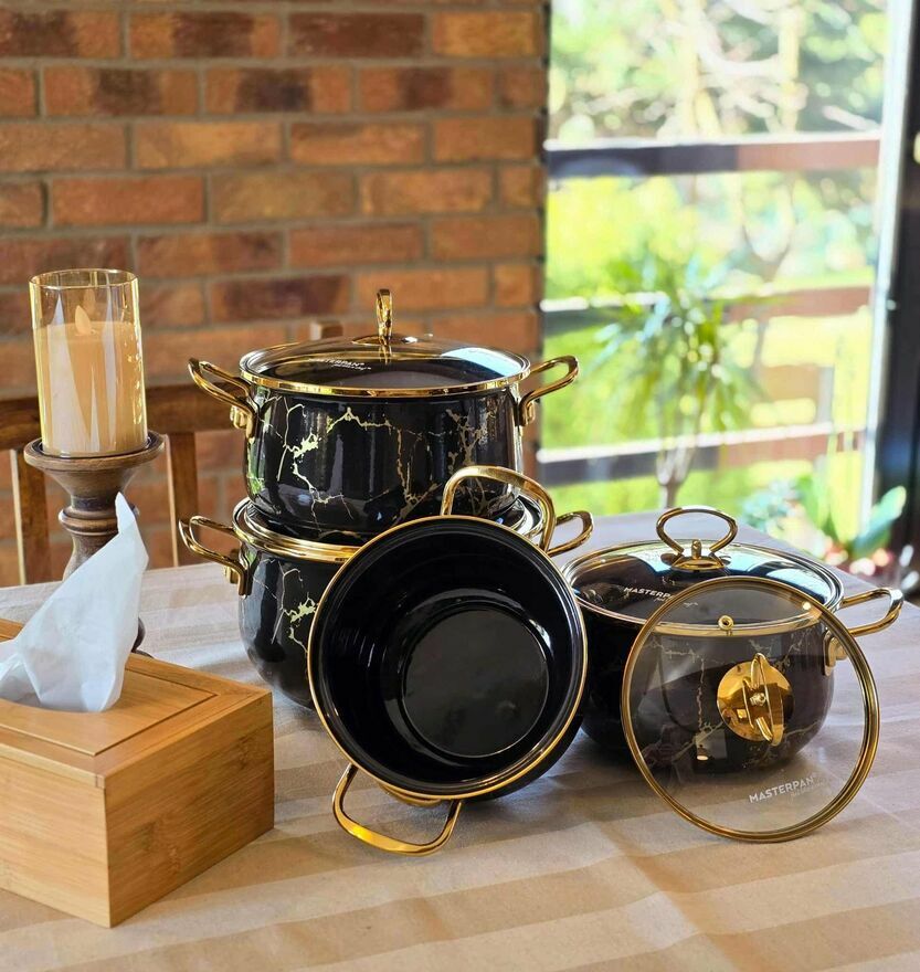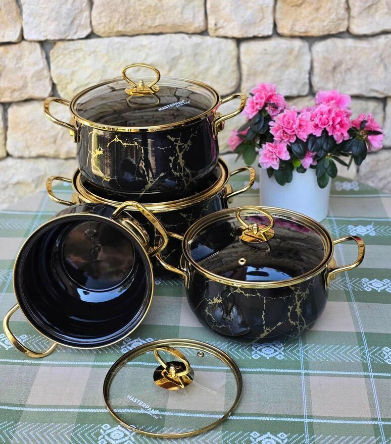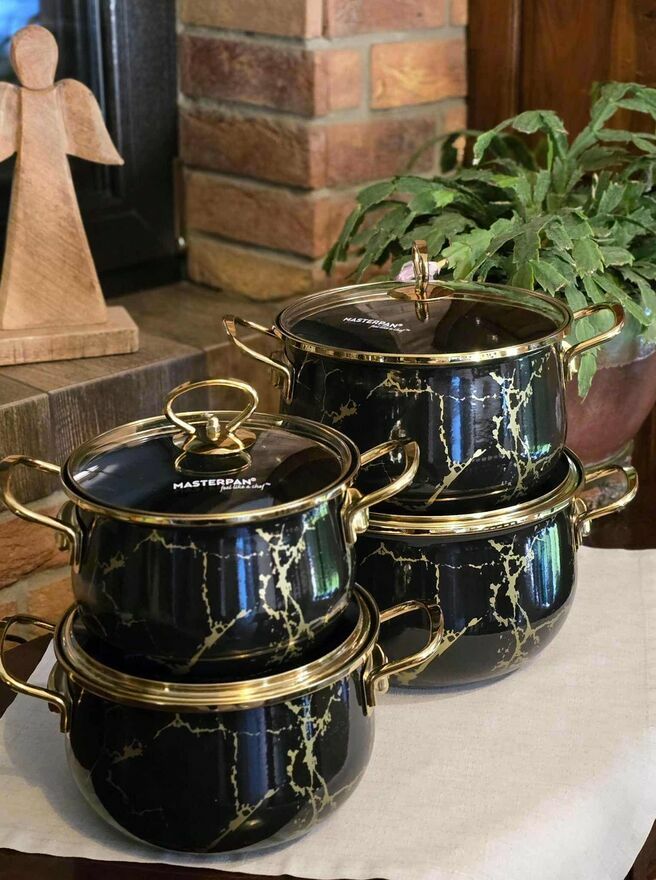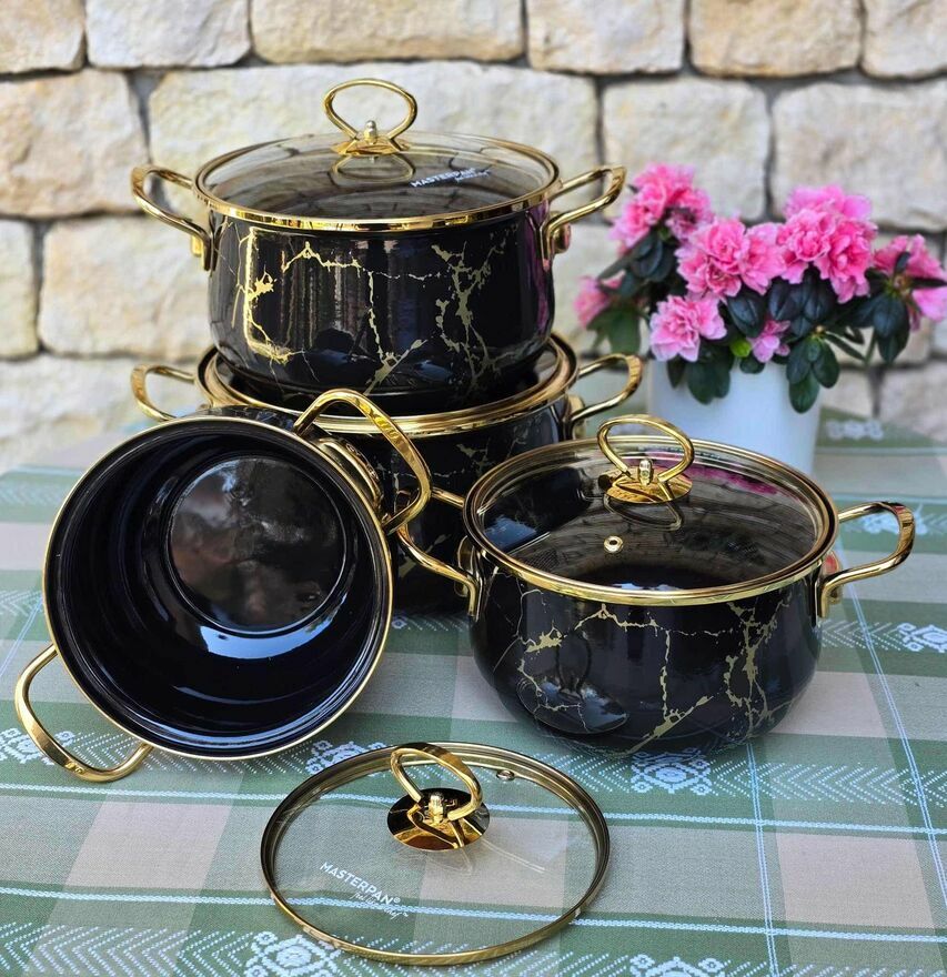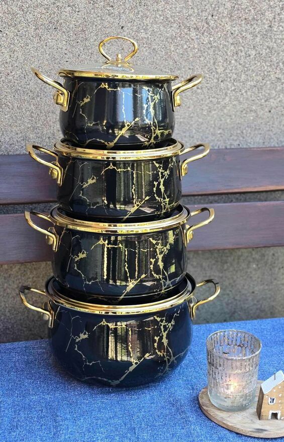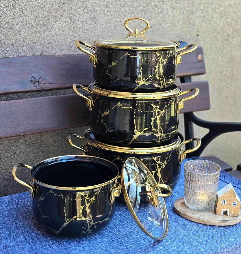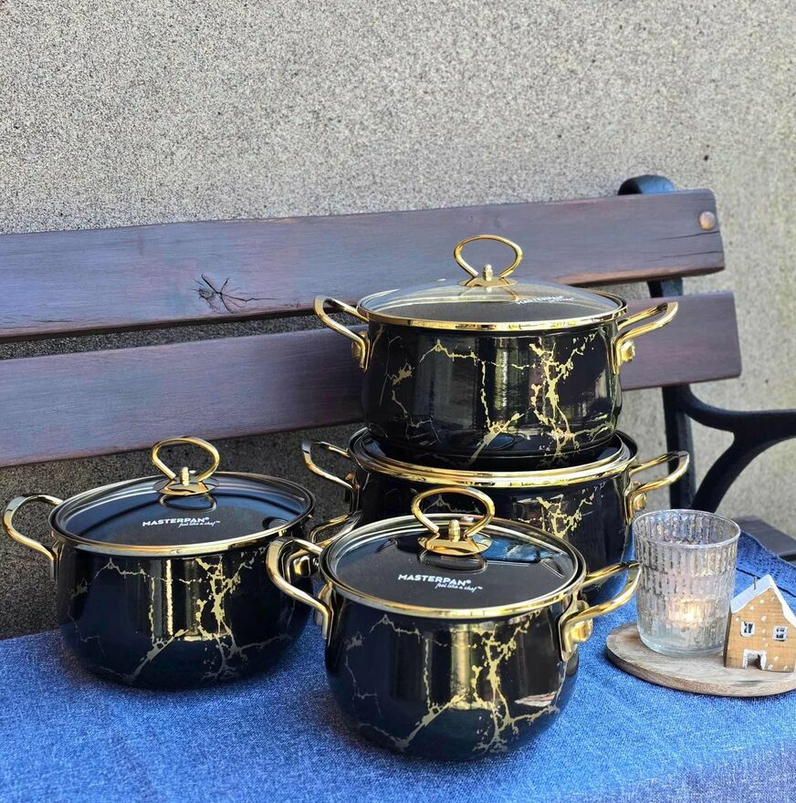 Witam,Garnki emaliowane zestaw garnków czarny ze złotym marmurem 8 elementów Masterpan MP 2634.