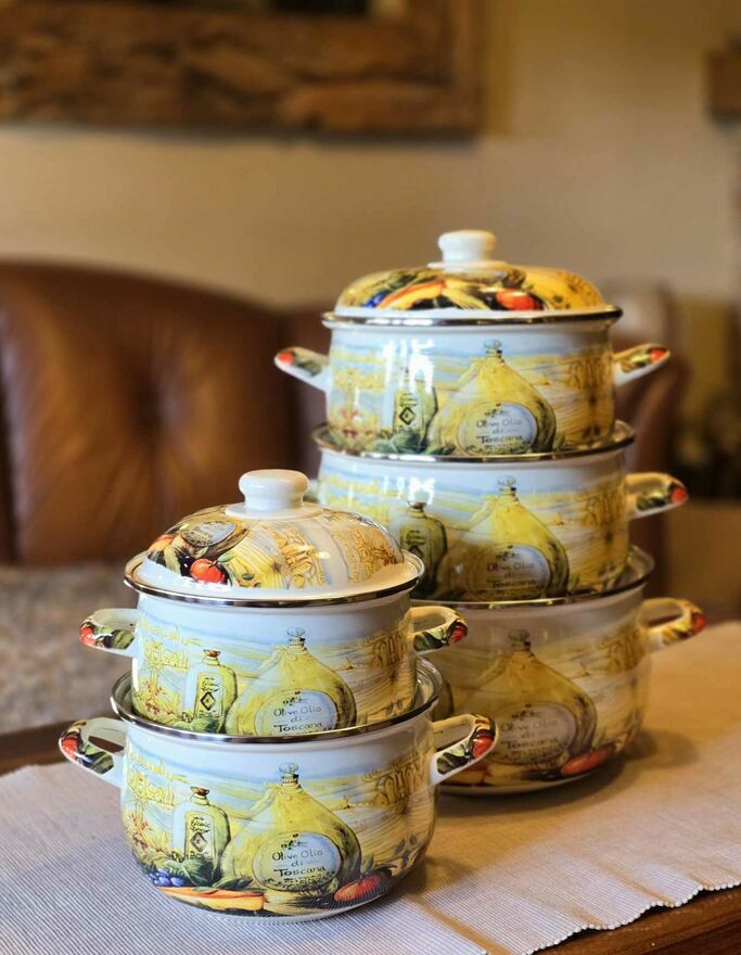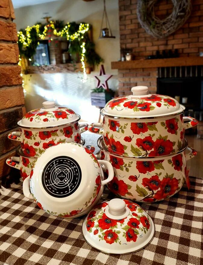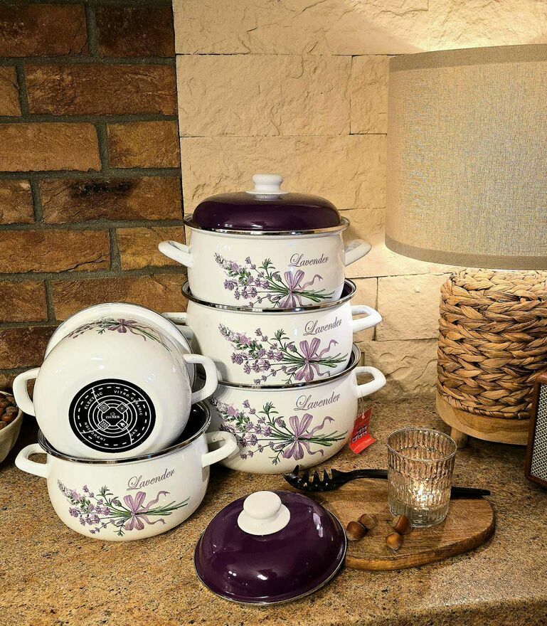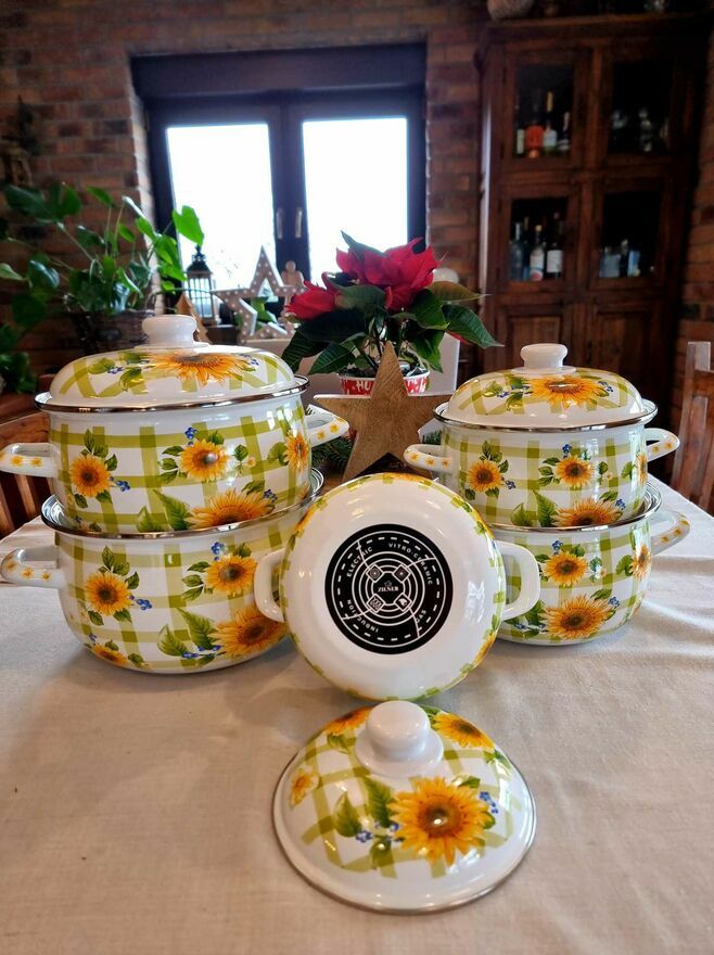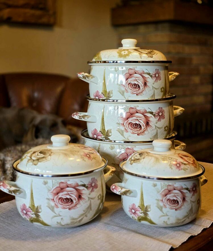 Dekoracyjny wzór na zewnętrznej stronie garnków dodaje uroku, a emaliowane pokrywki z plastikowymi uchwytami oraz uchwyty garnków zapewniają trwałość i komfort podczas codziennego użytkowania.