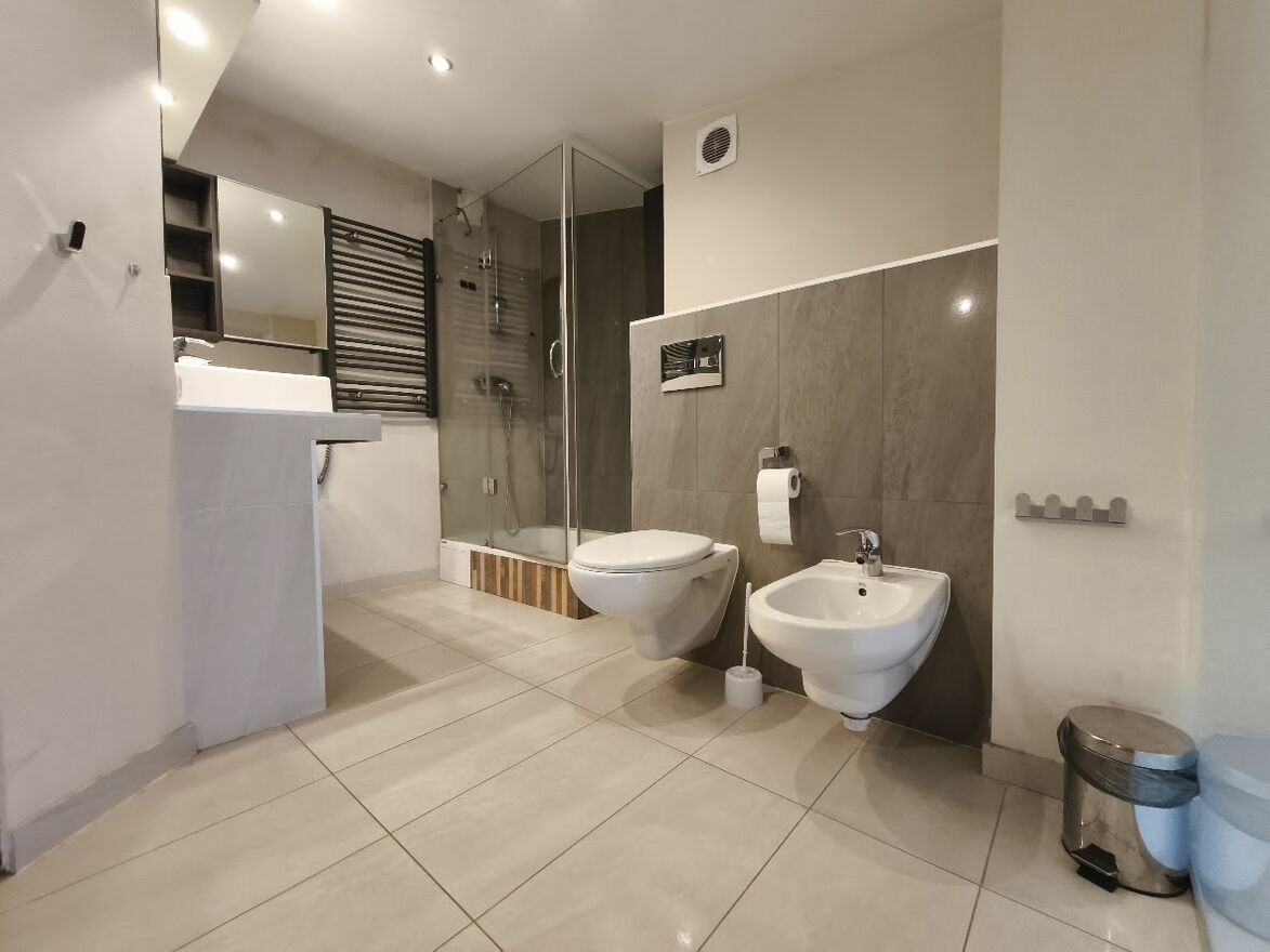 - Łazienka z oknem, prysznic, umywalka w blacie, bidet, wydzielone osobne miejsce na pralnię.