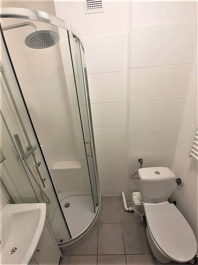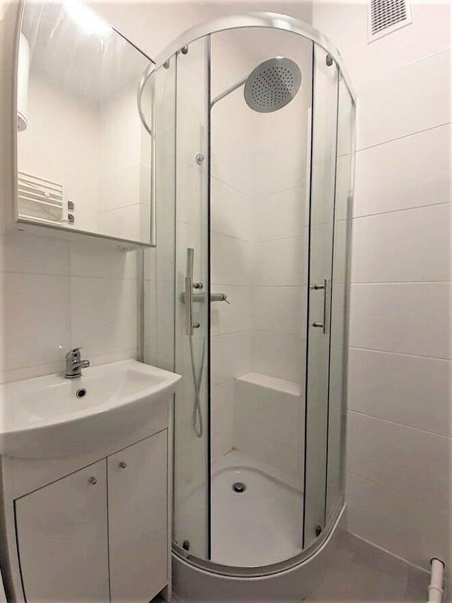 Łazienka: kabina prysznicowa, umywalka, lustro oraz WC.