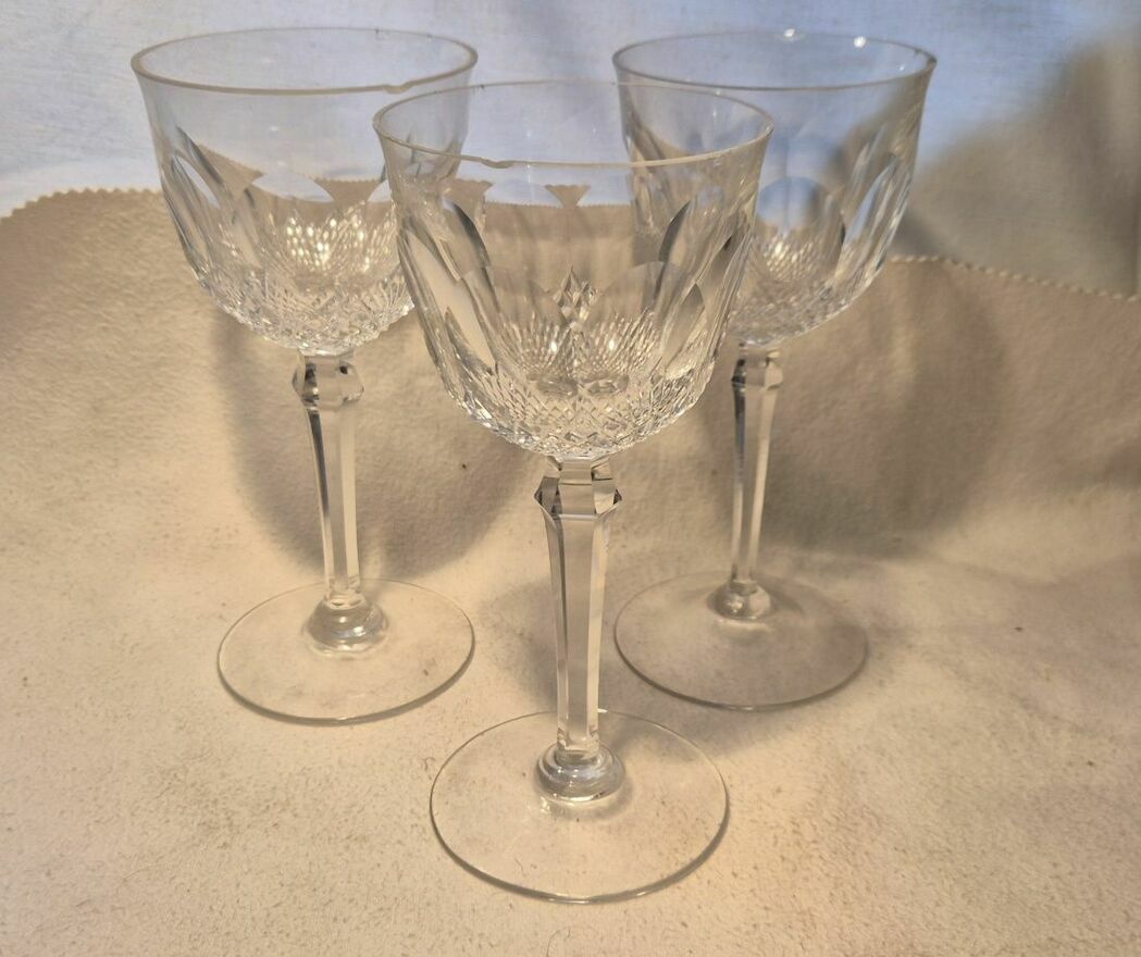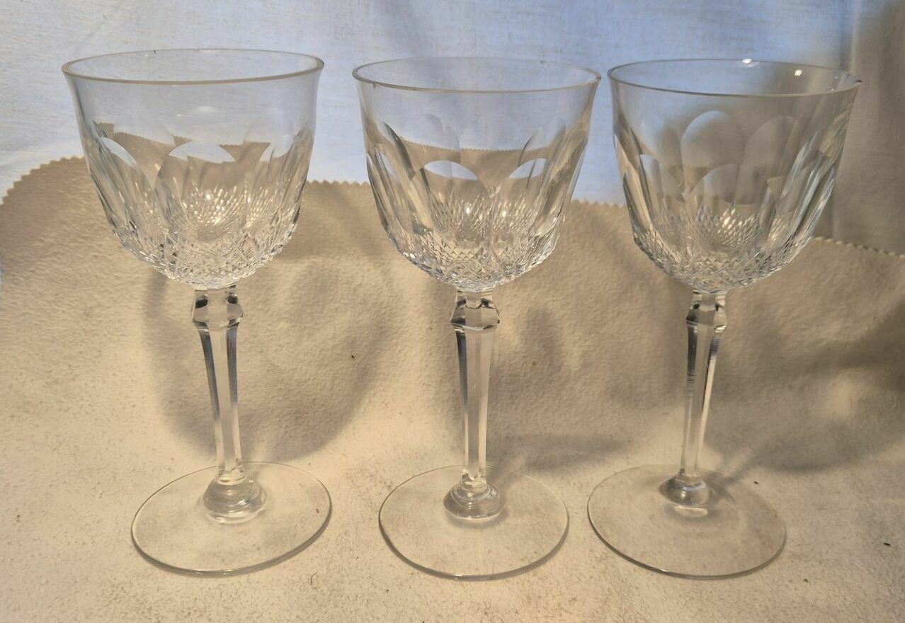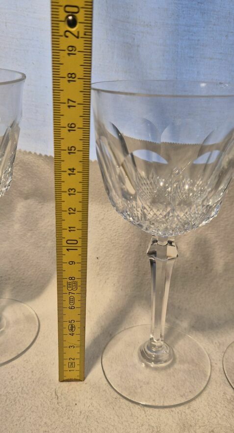 Zestaw 3 kryształowych bardzo starych kieliszków do wina o wysokości 17,5 cm. Eleganckie, przezroczyste szkło z charakterystycznym wzorem. Idealny na specjalne okazje lub jako stylowy dodatek do domu. Świetne dla kolekcjonera.Kieliszki mają delikatne uszczerbienia na brzegach. Podobno można zrobić renowację i to zeszlifować.