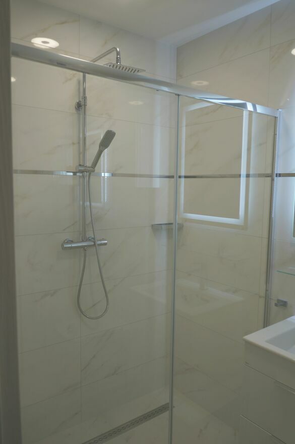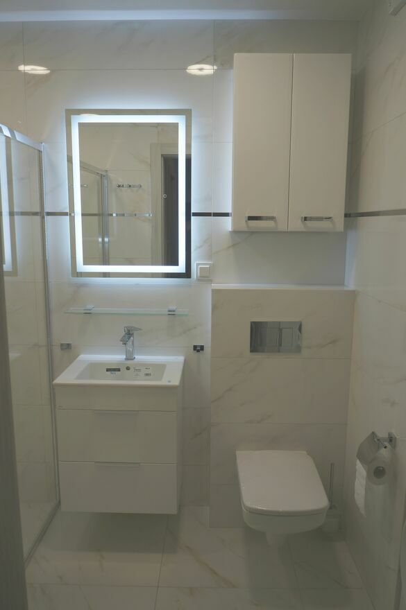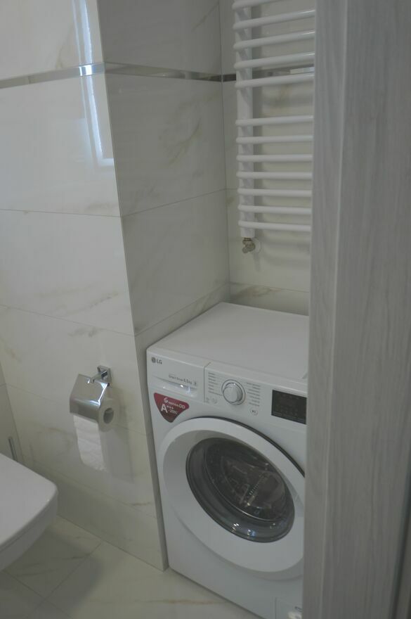 pralka LG direct drive 6,5kg, umywalka i szafka Roca, WC Koło Rimfree z deską samo opadającą, duża kabina prysznicowa z odpływem liniowym, bateria z deszczownicą, lustro z podświetleniem LED, górne lampy LED z głośnikiem i bluetooth (można sparować ze smartfonem i odtwarzać muzykę)