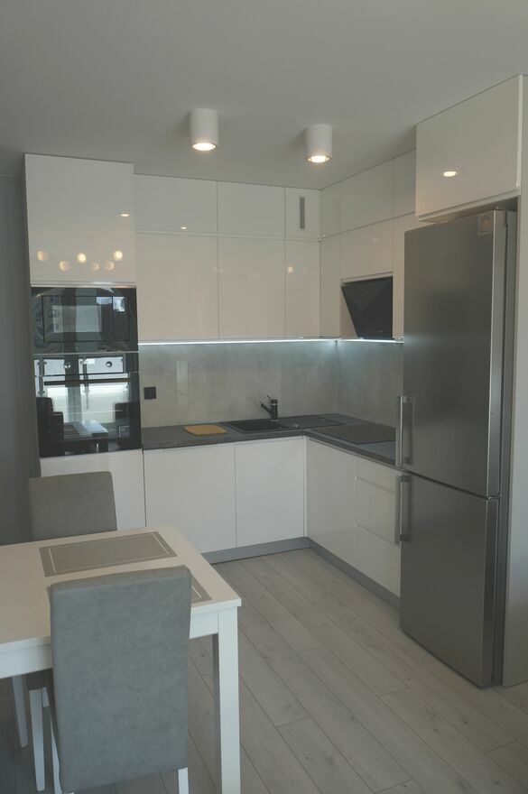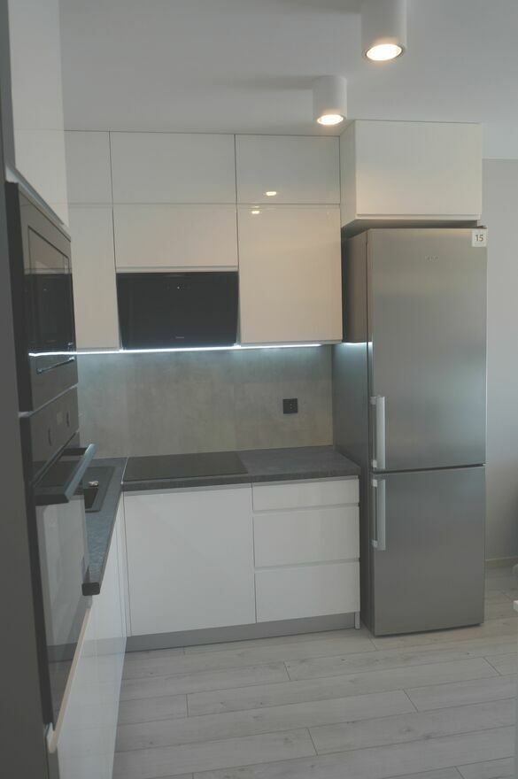Meble na zamówienie (fronty wysoki połysk), podświetlenie LED, duża zmywarka Electrolux, piekarnik Electrolux, mikrofala Electrolux, płyta indukcyjna TEKA, okap sterowany dotykowo TEKA, zlew Franke fragranit onyx i bateria Franke (z wyciąganą wylewką), duża i pojemna lodówka Bosch 205cm (total no frost), czajnik elektryczny INOX.