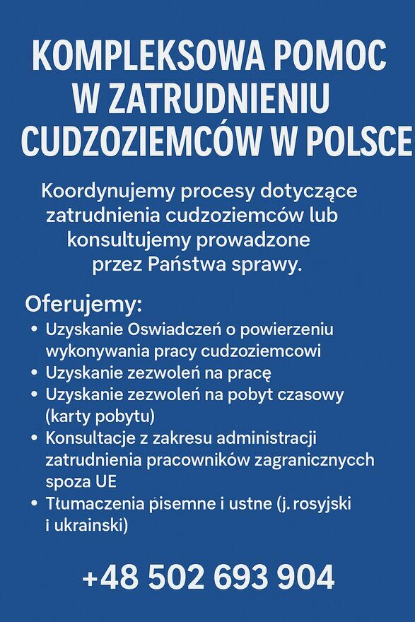 Nasza firma kompleksowo zajmuję się pomocą w zatrudnieniu cudzoziemców w Polsce.Obsługujemy cały proces legalizacji zatrudnienia, a także oferujemy współpracę jako doradcy merytoryczni — jesteśmy z Tobą na każdym kroku.