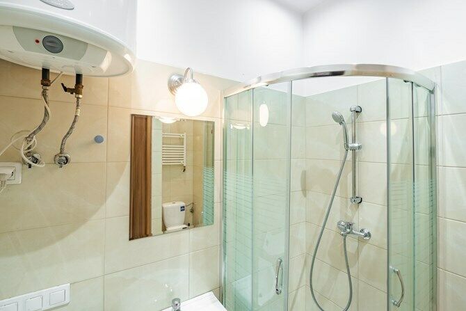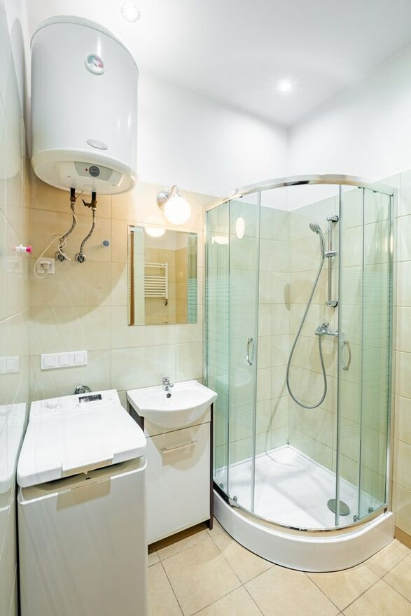 Łazienka w glazurze i terakocie: kabina prysznicowa, umywalka z