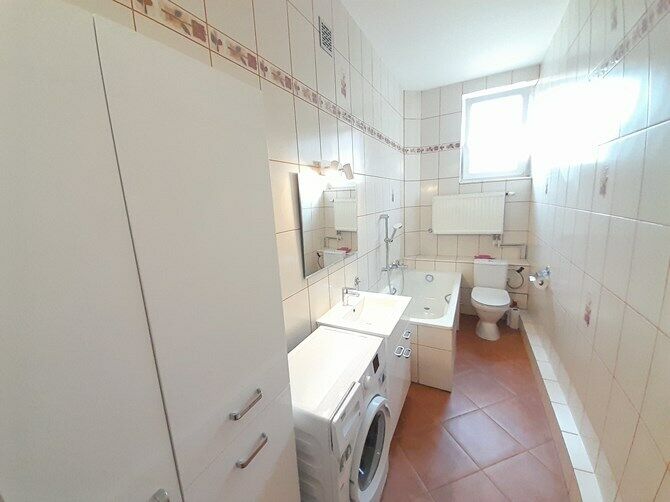 Łazienka z WC jest pralka, wanna, umywalka, szafka, lustro.