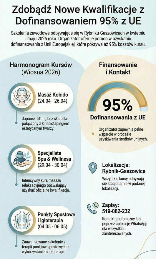Zapraszamy Wszystkich zainteresowanych na odbycie kursów masażu z dofinansowaniem ze środków UECena każdego kursu to 5000 zł, Ty płacisz tylko 250 zł (5%), a cała reszta jest pokryta ze środków UE