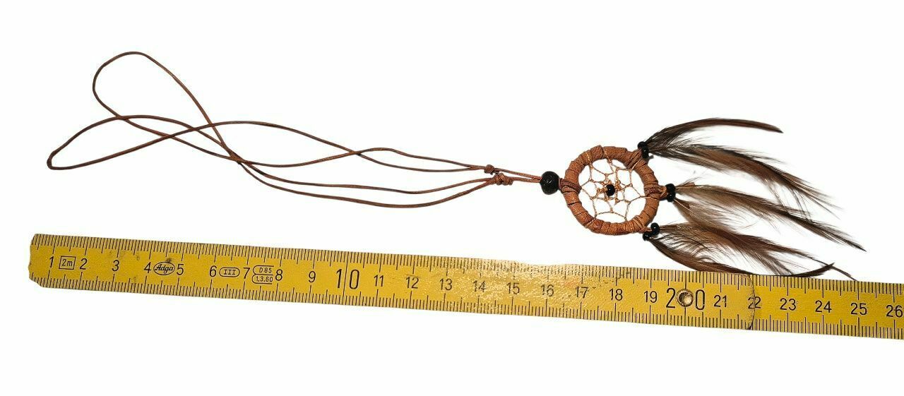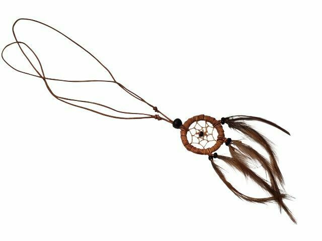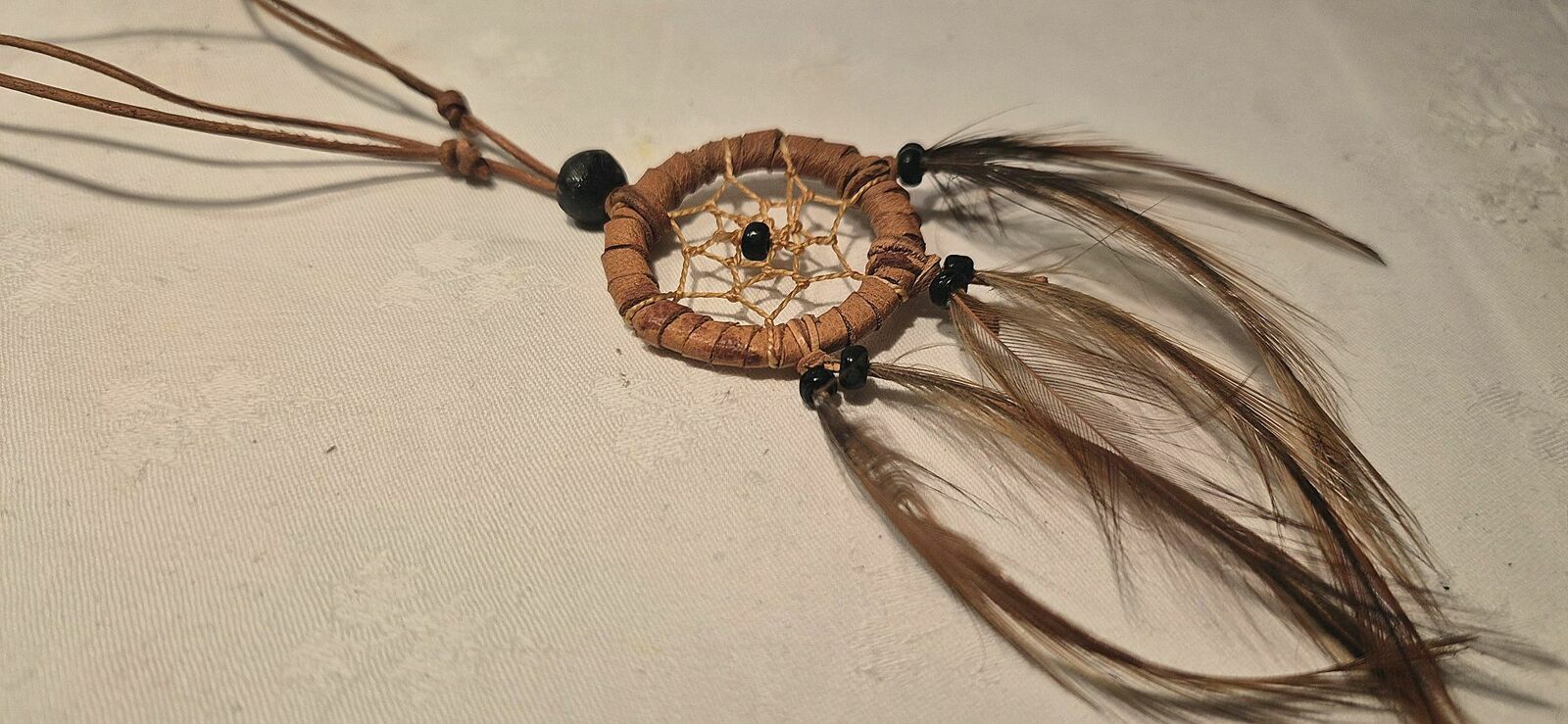 Ręcznie wykonany łapacz snów w ciepłych brązowych kolorach. Ozdobiony piórami i sznurkami, tworzy piękny, etniczny akcent. Idealny do dekoracji wnętrza lub jako oryginalny prezent. Produkt używany, wysokiej jakości.Zapraszam do zakupu