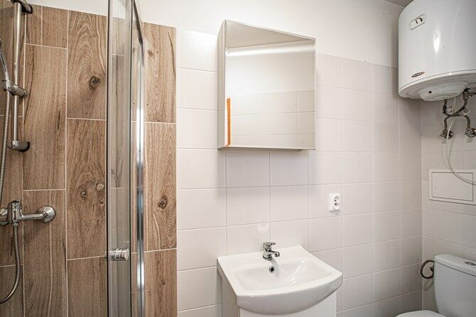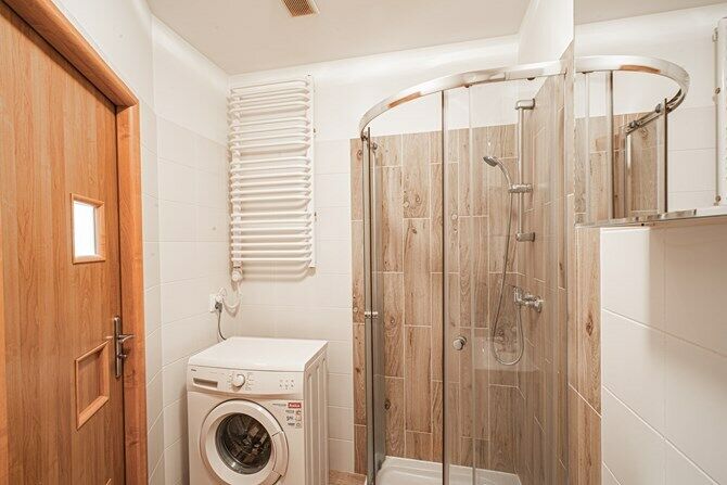 Łazienka z WC: kabina prysznicowa, umywalka z szafką, pralka, bojler
