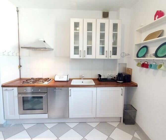 Kuchnia: szafki kuchenne, lodówka, zmywarka, płyta ceramiczna,