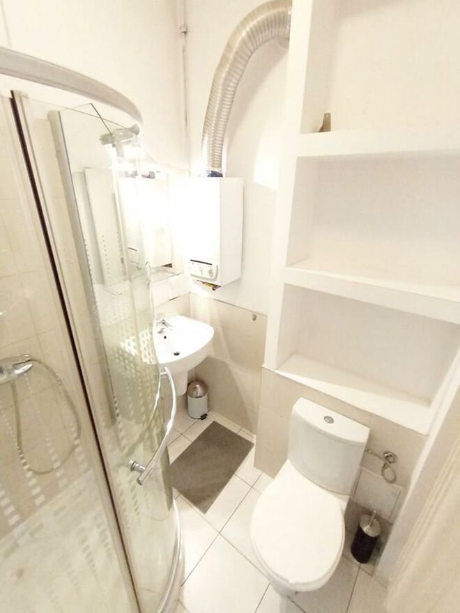 Łazienka z WC: kabina prysznicowa, podgrzewacz wody, umywalka z