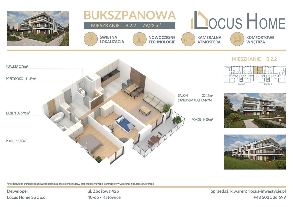 Oferta dodana za pomocą Multiportalu BeBrokerSpółka LOCUS HOME to DEWELOPER który realizuje inwestycje mieszkaniowe na terenie Katowic od wielu lat. NOWA inwestycja na ulicy BUKSZPANOWEJ (obok nr 19) w Piotrowicach to nowoczesny apartamentowiec w doskonałej lokalizacji Katowic.