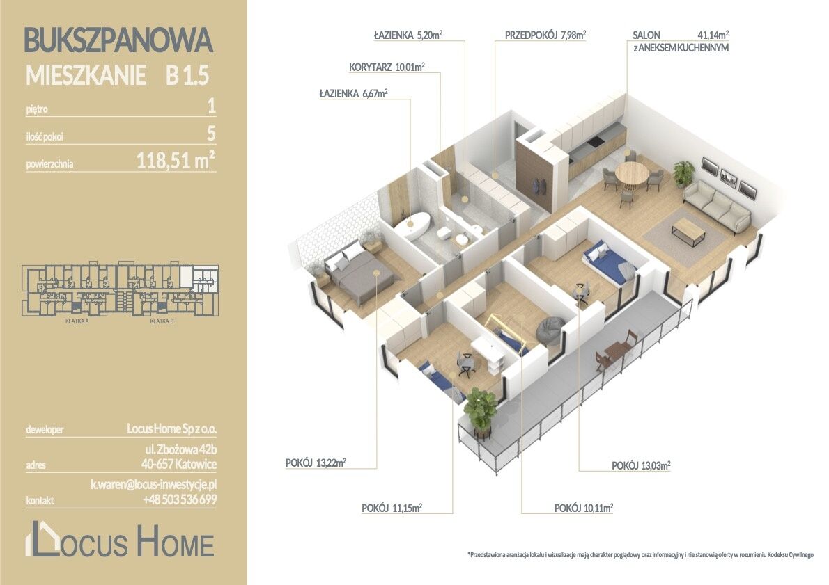 Przedstawiamy ofertę mieszkania 5 - pokojowego o powierzchni 118,51 m² z balkonem, zlokalizowanego na pierwszym piętrze budynku, oznaczonego nr B 1.5