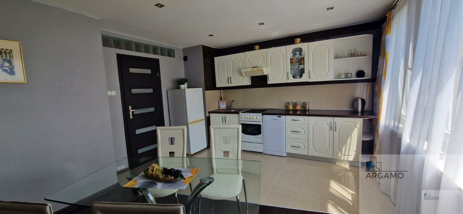 Kuchnia z jadalnią duża , jasna, z miejscem na duży stół; połączona z dawnym pokojem, co nadaje wnętrzu otwartości i lekkości.