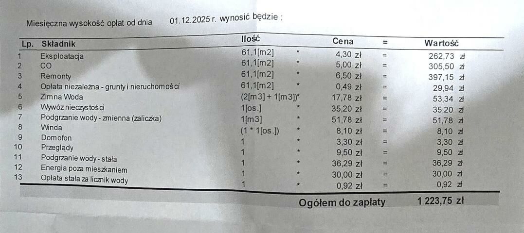 - czynsz eksploatacyjny wynosi ok. 1224 zł z zaliczkami na wodę ciepła i zimną oraz śmieci (spółdzielnia NA ALPACH);
