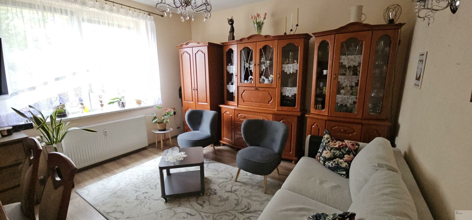 Wnętrze składa się z dwóch oddzielnych pokoi, (salon + sypialnia), łazienki z oddzielnym WC która zapewnia prywatność oraz wygodę oraz przechodniej kuchni bez okna co umożliwia oddzielenie przestrzeni kulinarnej od reszty mieszkania a dodatkowo jest wyposażona w niezbędne meble oraz kuchenkę z płytą gazową ---- łączna powierzchnia to 44.8 m2, do dyspozycji jest także piwnica o łącznej powierzchni 8,7 m2.