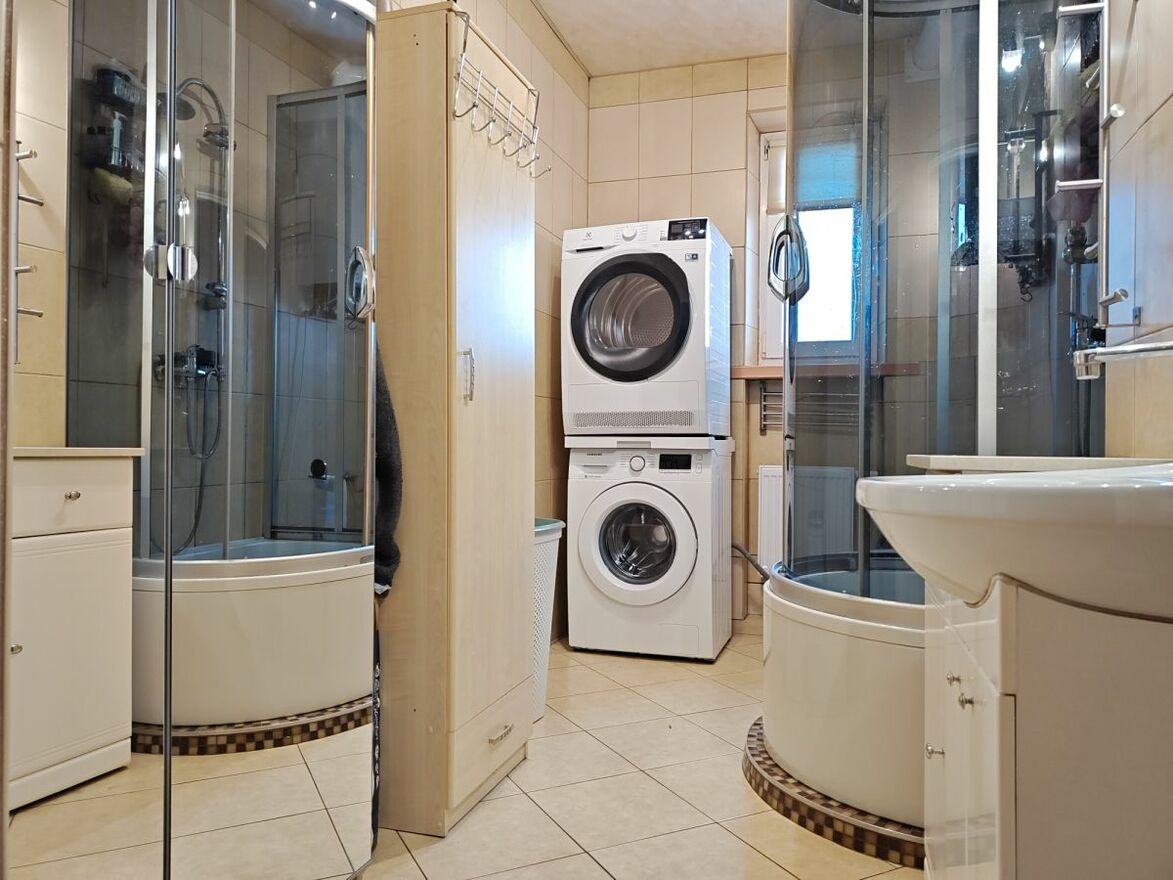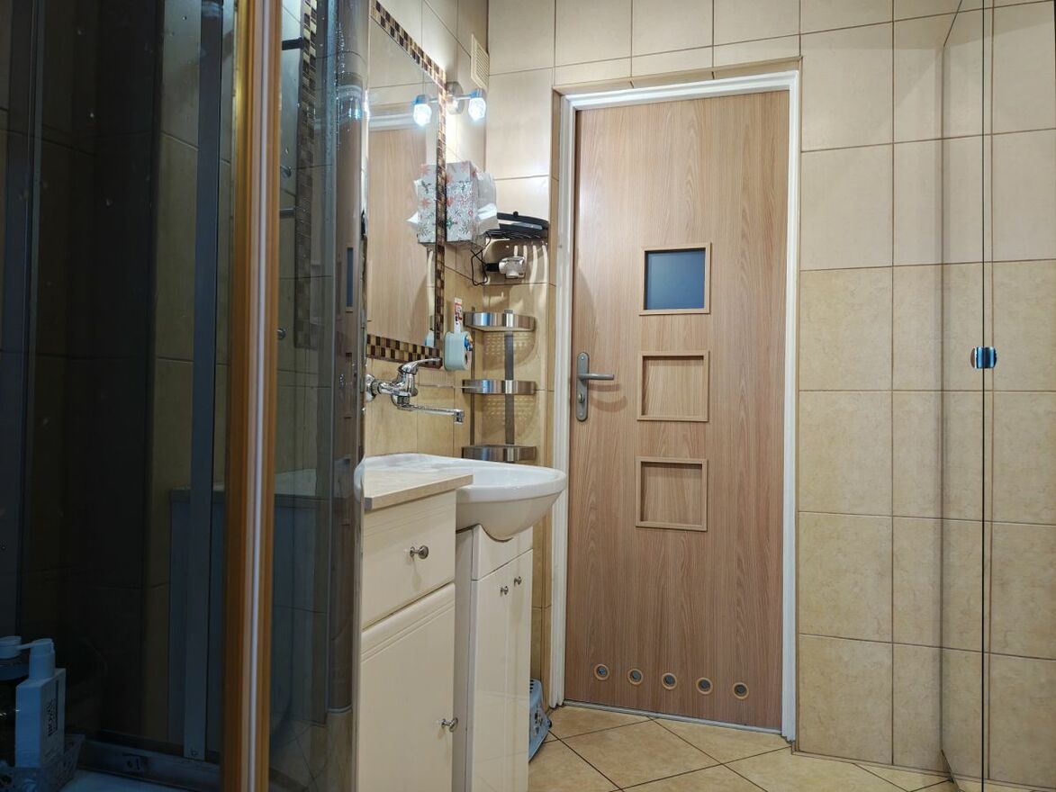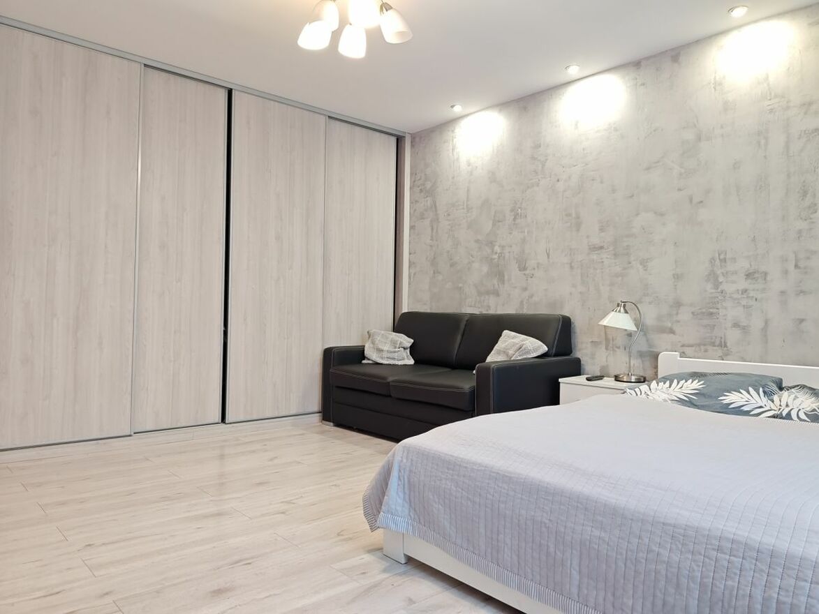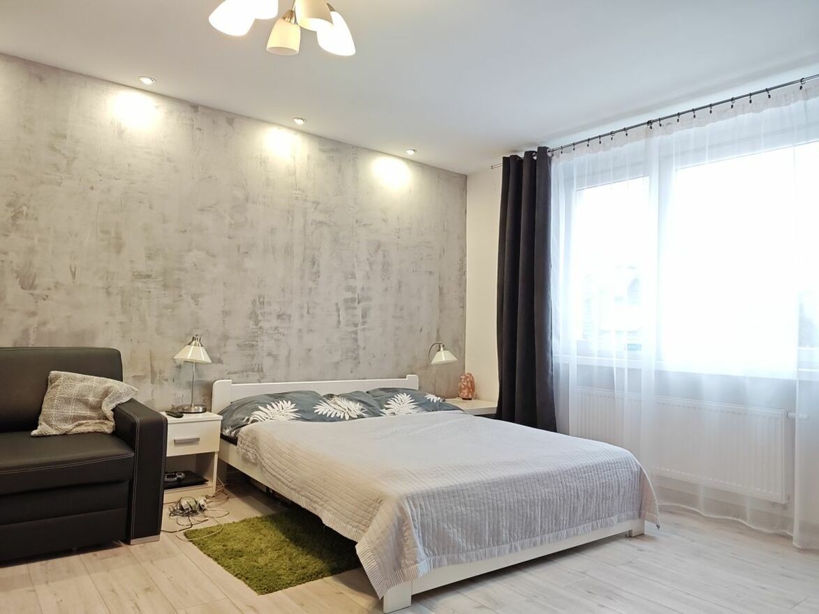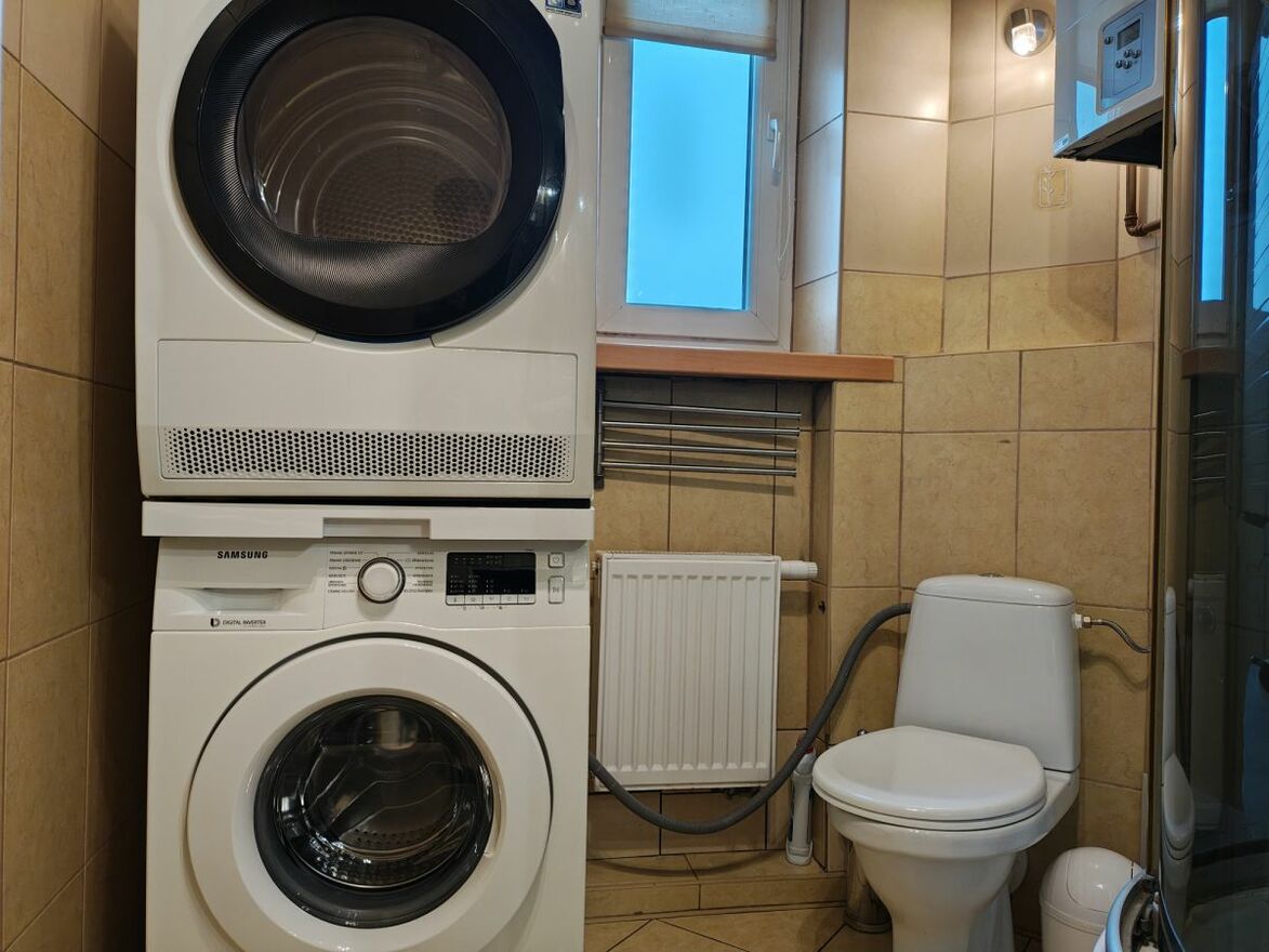Lokal jest umeblowany i gotowy do zamieszkania. W sypialni znajduje się duże łóżko oraz szafa. W łazience jest prysznic, pralka oraz miejsca do przechowywania.