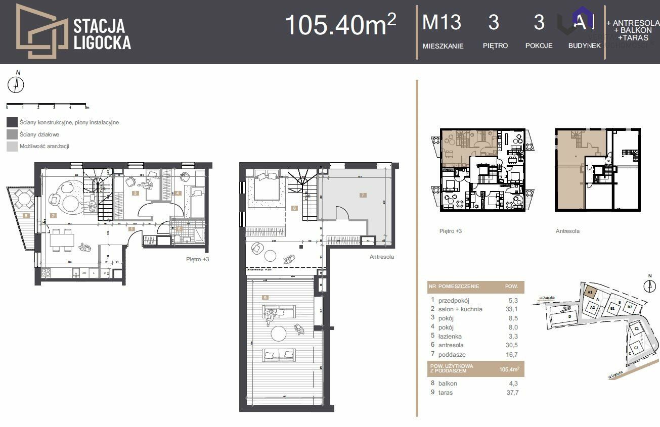 Mieszkanie składające się z 3 pokoi o powierzchni 105,40m2 + ANTRESOLA + TARAS + BALKON - dokładny rzut jest przedstawiony w ofercie!