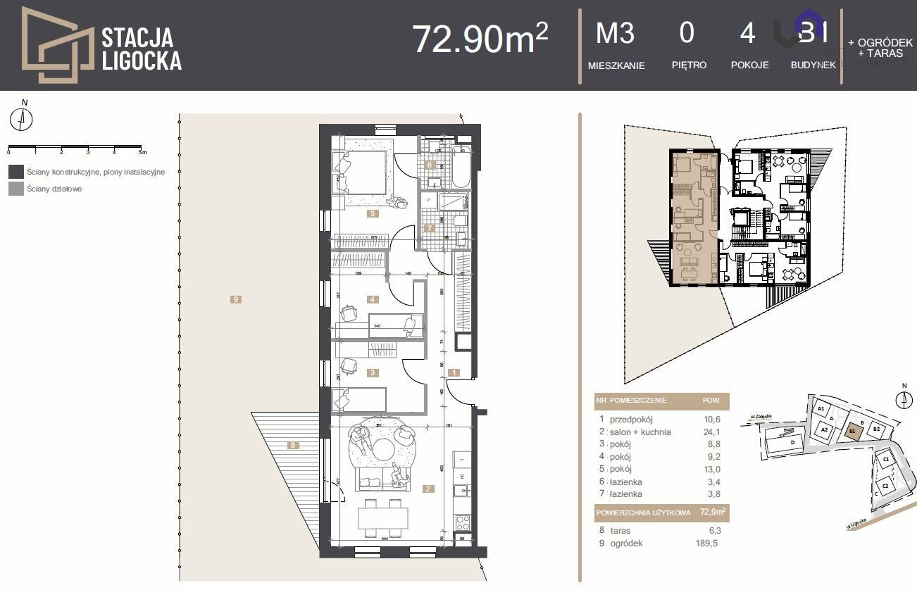Mieszkanie składające się z 4 pokoi o powierzchni 72,90m2 + OGRÓDEK 189,5m2 + TARAS 6,3m2 - dokładny rzut jest przedstawiony w ofercie!