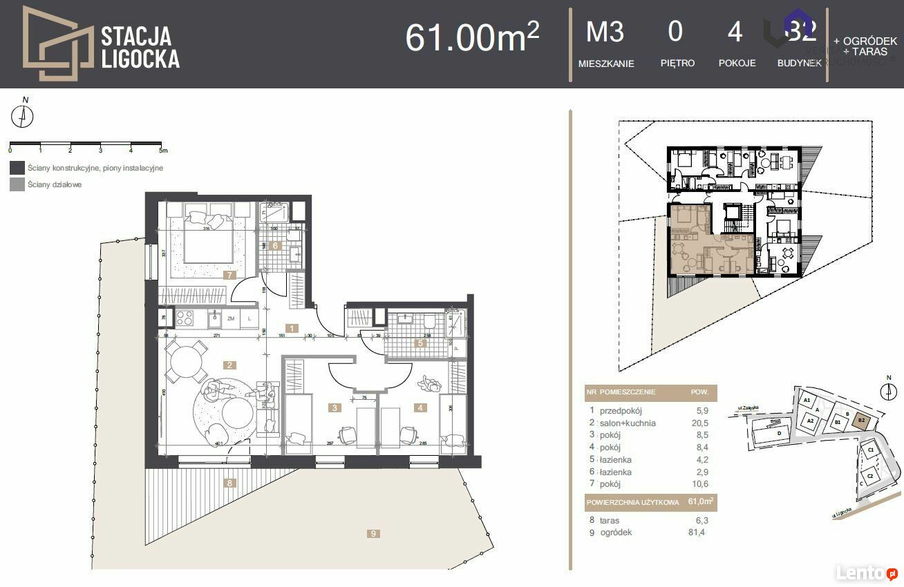Mieszkanie składające się z 4 pokoi o powierzchni 61m2 + TARAS 6,30m2 + OGRÓDEK 81,40m2 - dokładny rzut jest przedstawiony w ofercie!