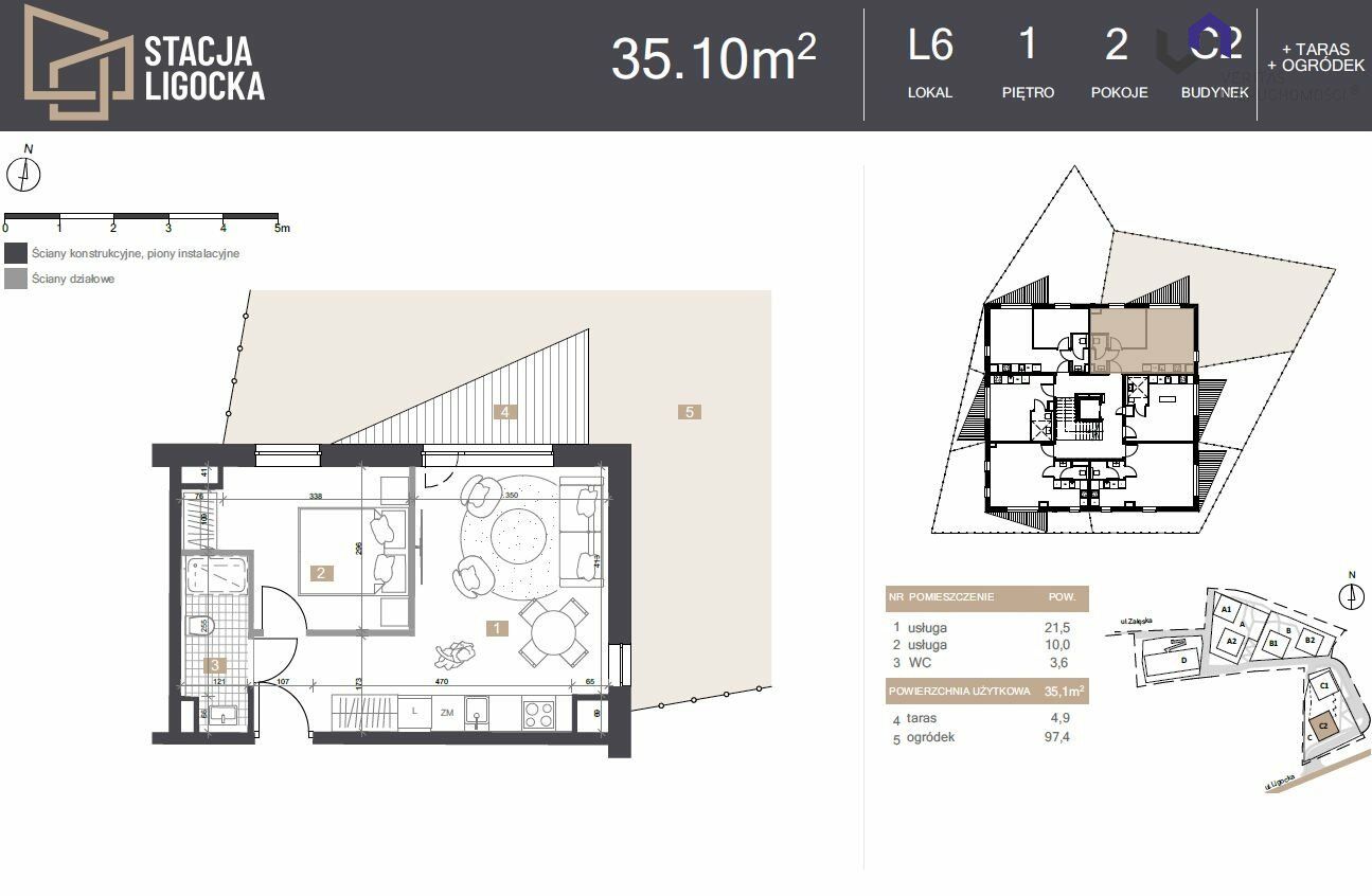 Składający się z 2 pokoi o powierzchni 35,10m2 + TARAS 4,9m2 + OGÓRDEK 97,40m2 - dokładny rzut jest przedstawiony w ofercie!
