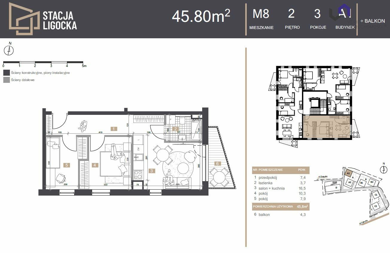 Stacja Ligocka to nowoczesne osiedle, składające się z 4 budynków wielorodzinnych, które harmonijnie wpisują w otaczającą zieleń i charakteryzują się przemyślaną, funkcjonalną architekturą. Kształt budynków nawiązuje do brył węgla, a czarna kolorystyka elewacji dodatkowo podkreśla ten unikalny klimat. Integralną częścią inwestycji są kaskadowe tereny zielone, strefy wypoczynkowe oraz nowoczesny plac zabaw dla dzieci - to wszystko tworzy przyjazne i komfortowe środowisko dla przyszłych mieszkańców.