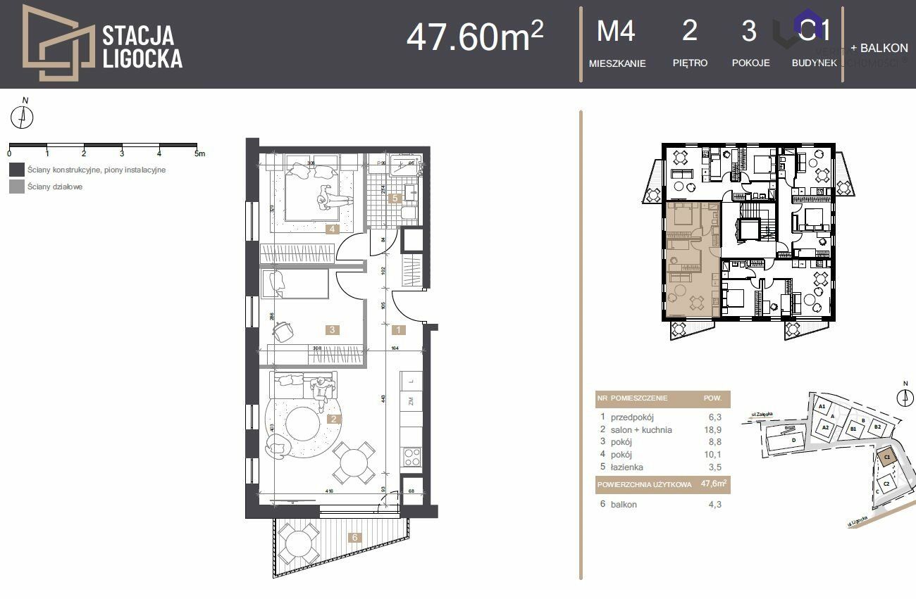 Stacja Ligocka to nowoczesne osiedle, składające się z 4 budynków wielorodzinnych, które harmonijnie wpisują w otaczającą zieleń i charakteryzują się przemyślaną, funkcjonalną architekturą. Kształt budynków nawiązuje do brył węgla, a czarna kolorystyka elewacji dodatkowo podkreśla ten unikalny klimat. Integralną częścią inwestycji są kaskadowe tereny zielone, strefy wypoczynkowe oraz nowoczesny plac zabaw dla dzieci - to wszystko tworzy przyjazne i komfortowe środowisko dla przyszłych mieszkańców.