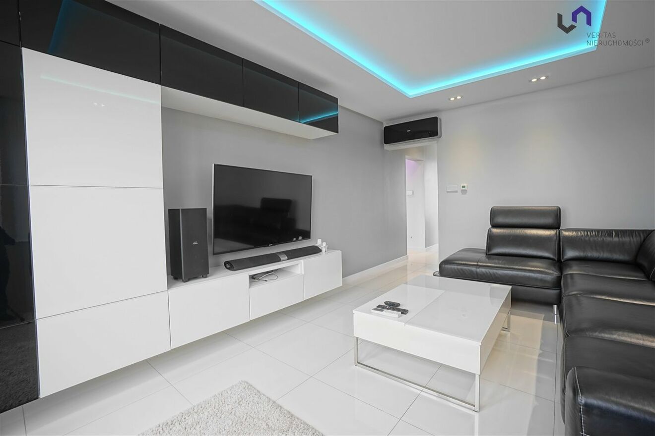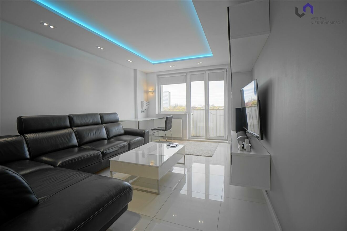 - Duzy przestronny Salon(duża kanapa, stolik kawowy, biurko z krzesłem, telewizor, soundbar, klimatyzacja ) z wyjściem na balkon - widok w kierunku Katedry, Stadionu Śląskiego