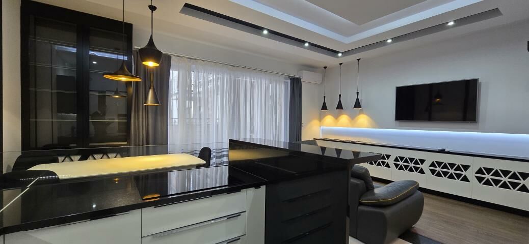 Kuchnia Premium: Wykończona granitem, wyposażona w sprzęty (płyta indukcyjna, piekarnik, lodówka).