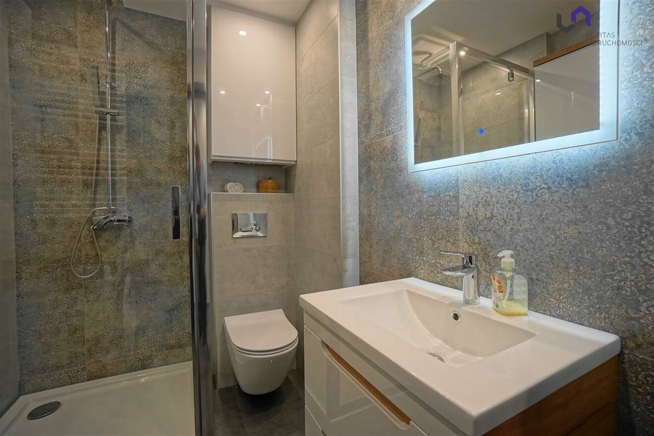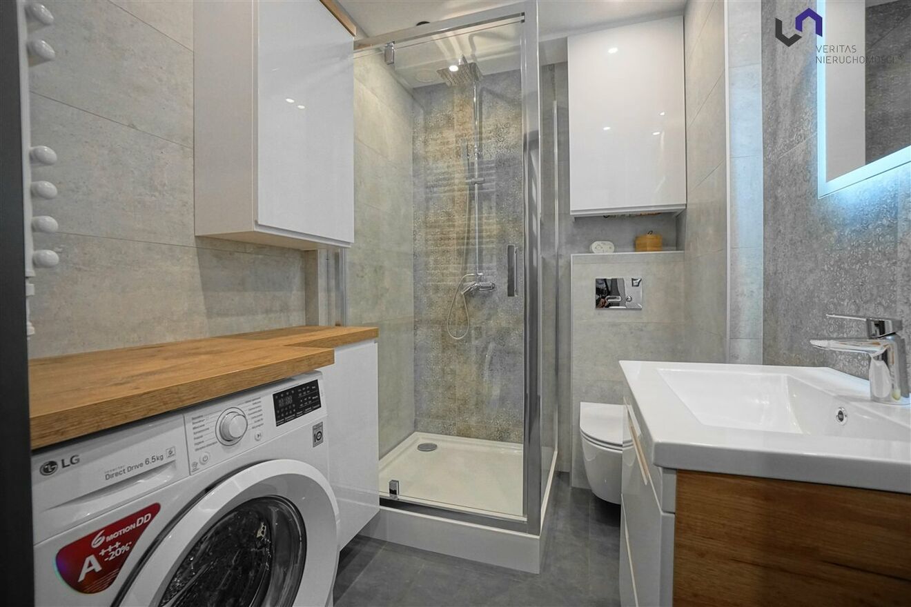 - Łazienka(Duża kabina prysznicowa, pralka LG, szafki, kosz na pranie).