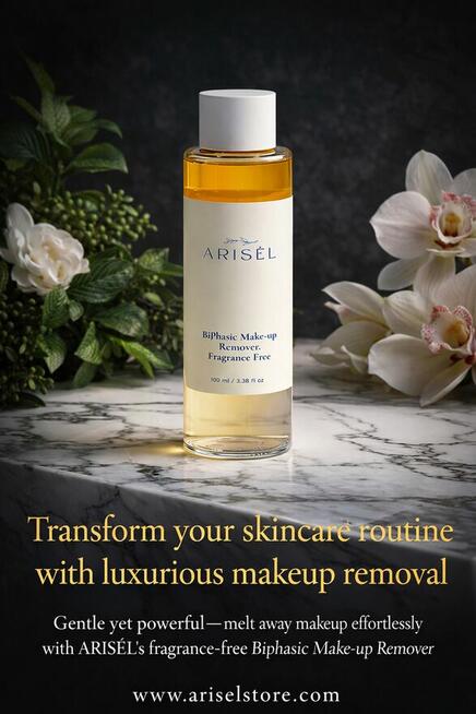 Poznaj luksusowy, dwufazowy płyn do demakijażu ARISĒL, który z łatwością rozpuszcza codzienne zanieczyszczenia oraz ...