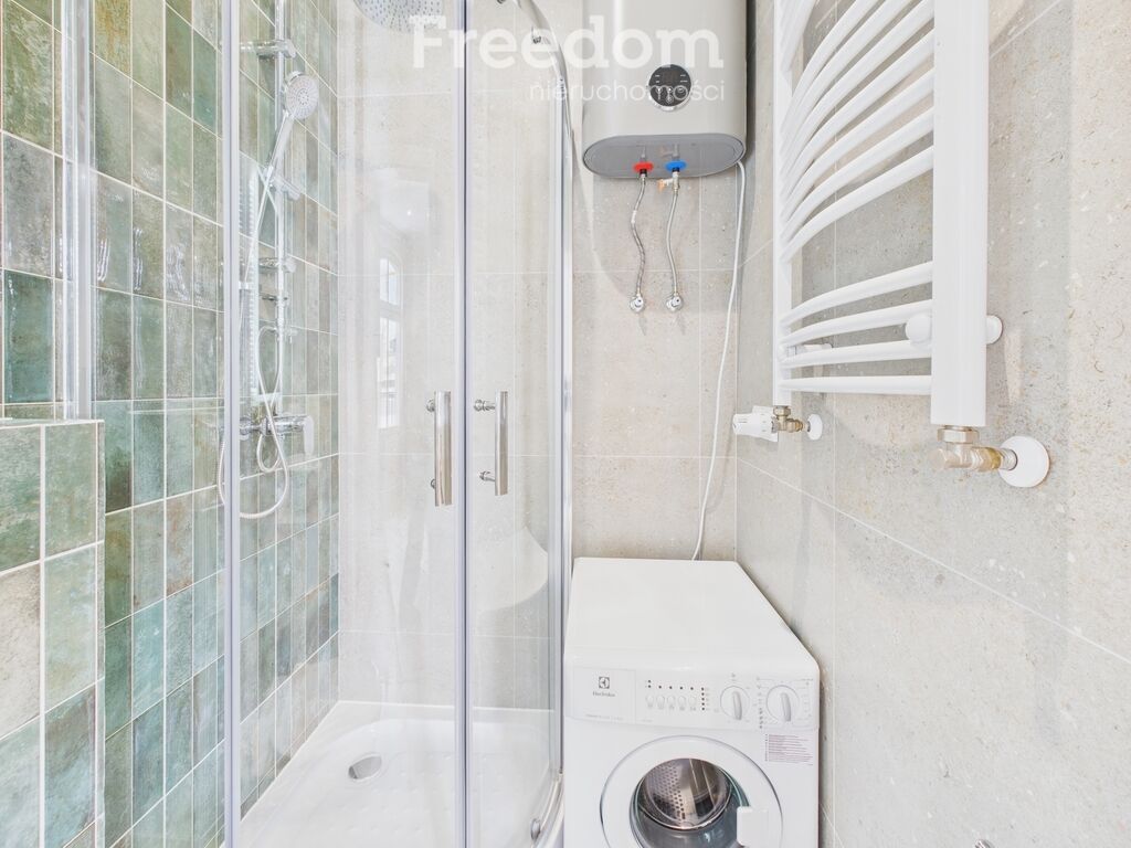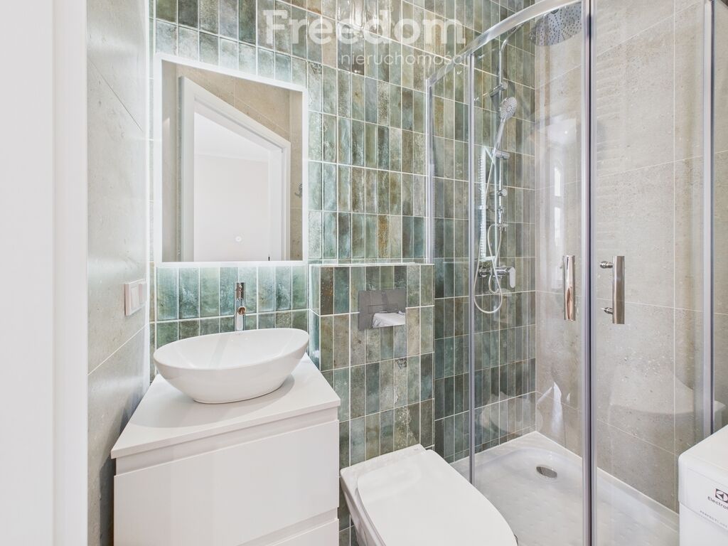Łazienka wyposażona jest w prysznic, WC, pralkę oraz podświetlane