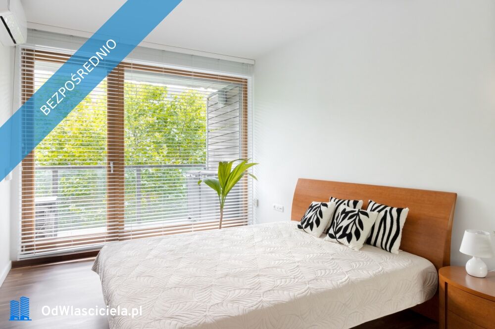 Komfortowa, w pełni umeblowana sypialnia z pojemną szafą w zabudowie, wyposażona w klimatyzację oraz bezpośredni dostęp do balkonu.