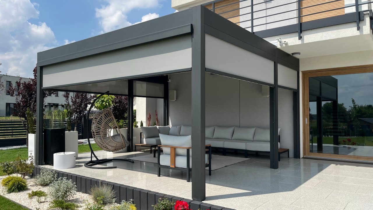 Pergola to nowoczesne i praktyczne zadaszenie tarasu chroniące przed słońcem. Pergola tarasowa ze zwijanymi roletami chroniącymi od wiatru. Czujnik deszczu - automatycznie zamknie dach podczas deszczu. Czujnik wiatru - automatycznie zwinie screeny (rolety) podczas bardzo silnego wiatru by uchronić je przed uszkodzeniem
