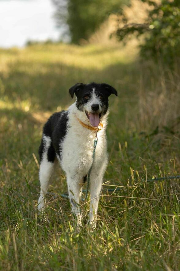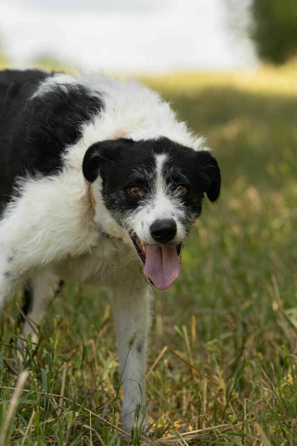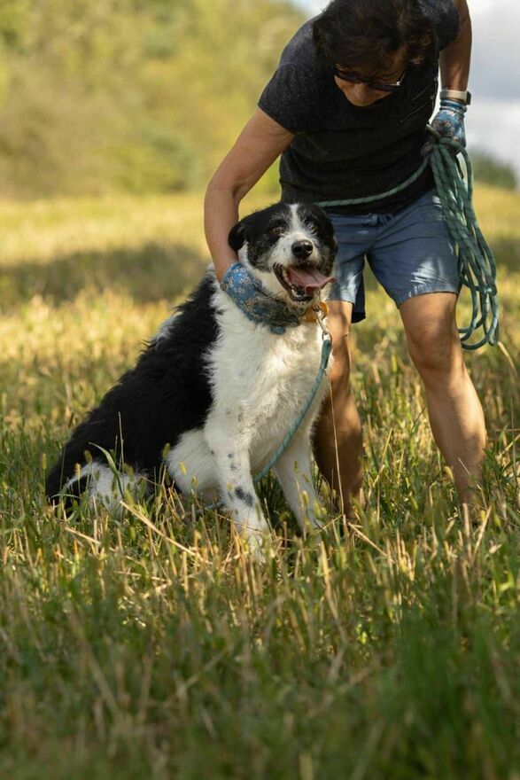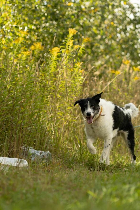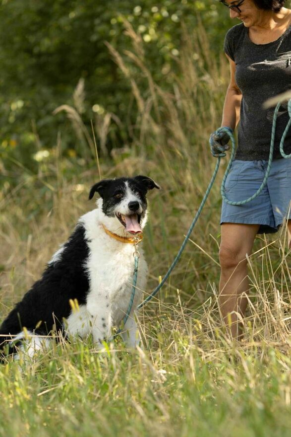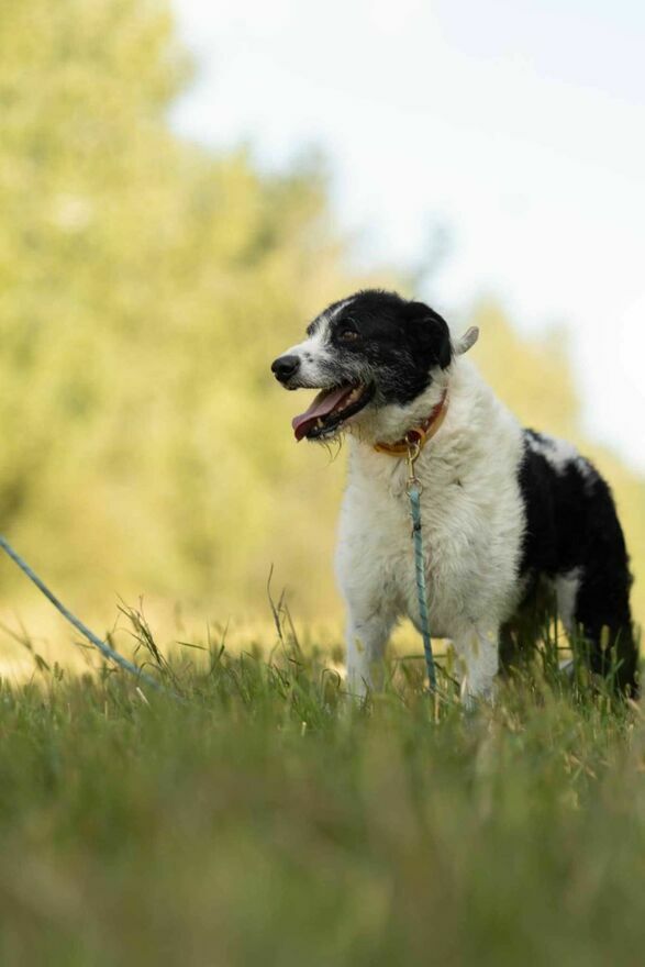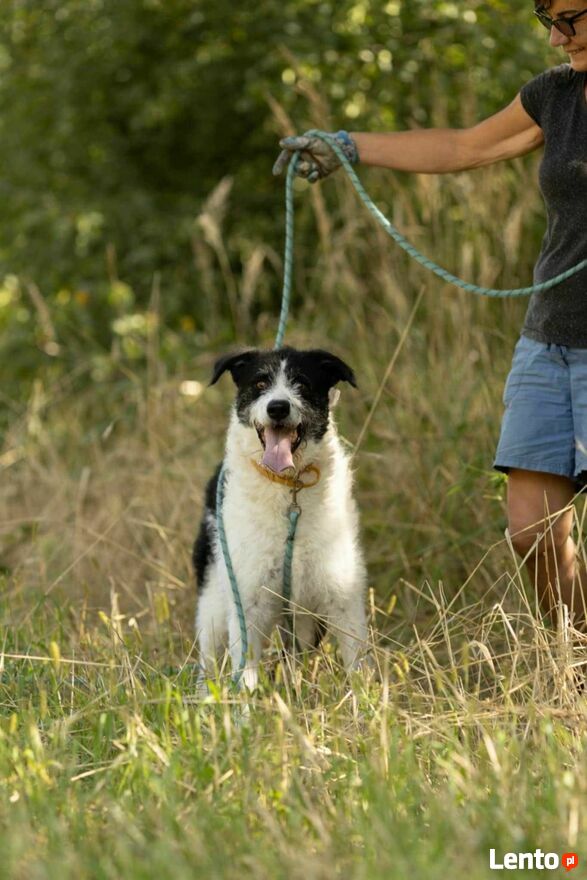 Pięknie spaceruje na smyczy, nie ciągnie, uwagę skierowaną ma na człowieka i za chwilę wolności odwdzięcza się " buziakami ".