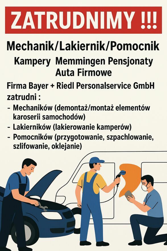 ZATRUDNIMY !!!Mechanik/Lakiernik/Pomocnik Kampery Memmingen Pensjonaty Auta Firmowe