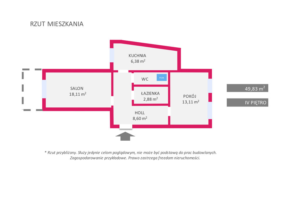Mieszkanie o powierzchni 49,83 m2, składa się z przestronnego salonu