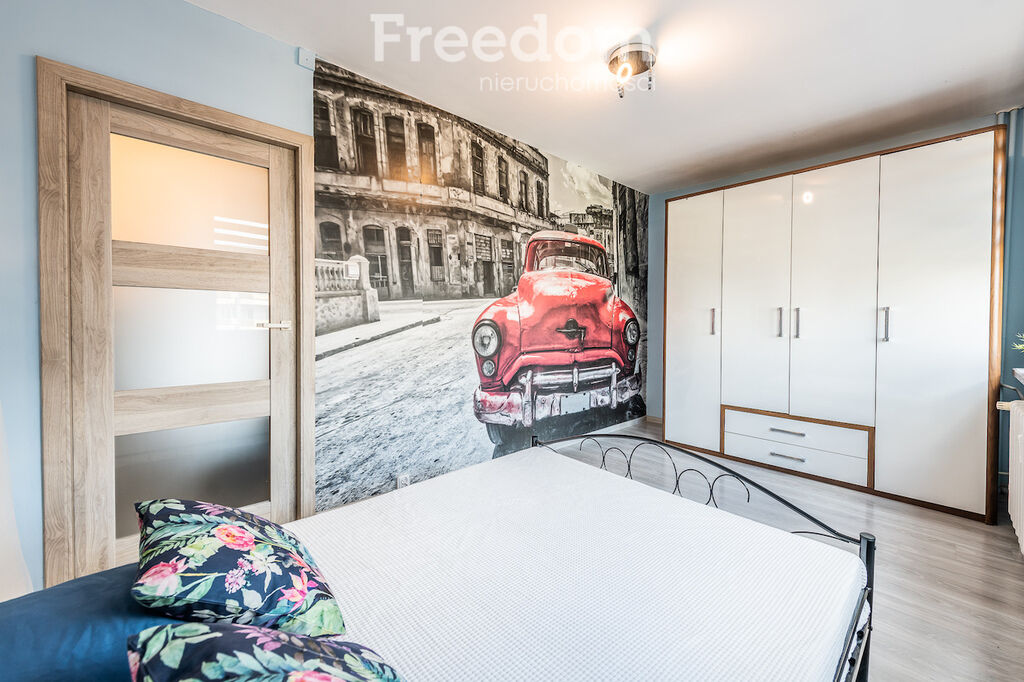 szafki RTV oraz szklanego stołu z 4 krzesłami. W sypialni mieści